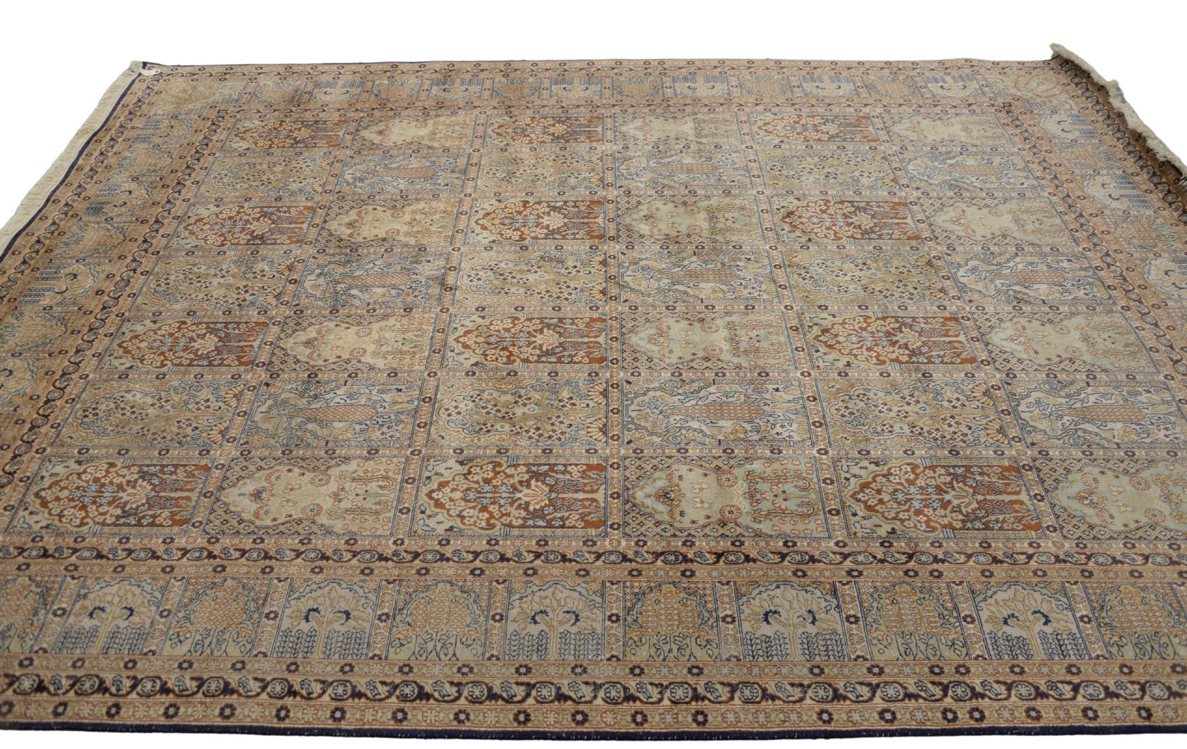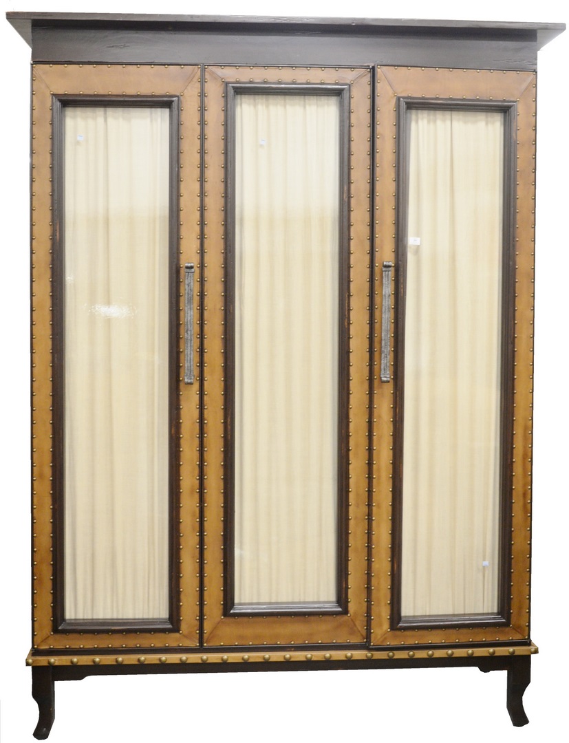 Large Bausman and Company Three-Door Cabinet, having leather and tac, framed glass doors and shelves on interior, height 102 inches, width 78 inches, depth 24 inches.