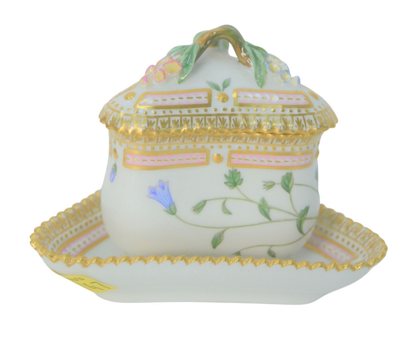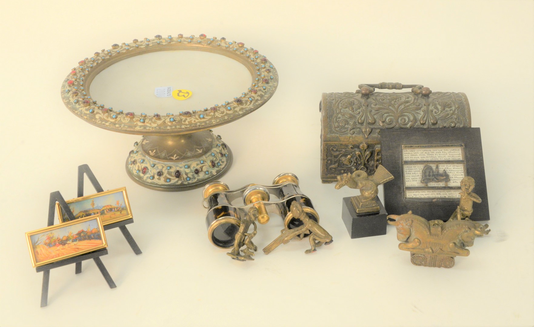 Tray Lot Having Five Bronze Figures, small bronze German dome-top chest, jeweled footed compote. Provenance: The Estate of Alina Roisen, Park Avenue, New York.