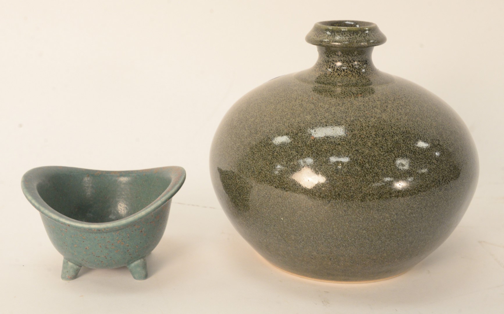 Two Piece Group of Ceramic, to include a Gunnar NyLund footed bow, height 2 1/2 inches, marked Sweden GN?; and a Yngve Blixt Hoganas ceramic glazed vase, signed on bottom, height 6 inches.
