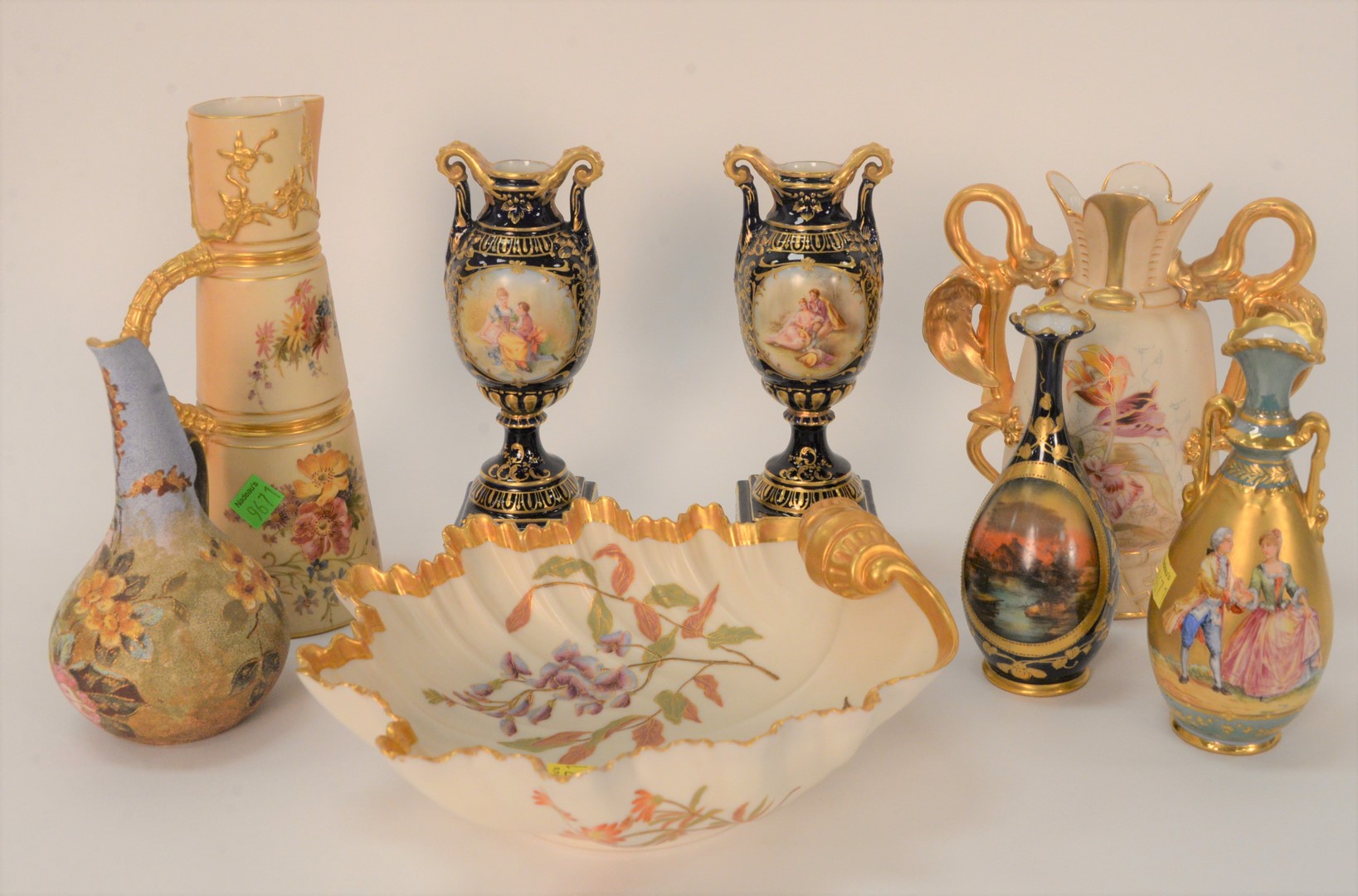 Eight Porcelain Vases, to include pair of Royal Vienna urns on bases with painted figure, marked on bottom; Rudolstadt porcelain vase; Dresden porcelain bud vase; Robert Hanke Austria Porcelain Vase, with gilt dragon handles; Royal Worcester urn (chipped); a scallop edge bowl; along with a small pitcher; Royal Vienna height 8 1/4 inches.
