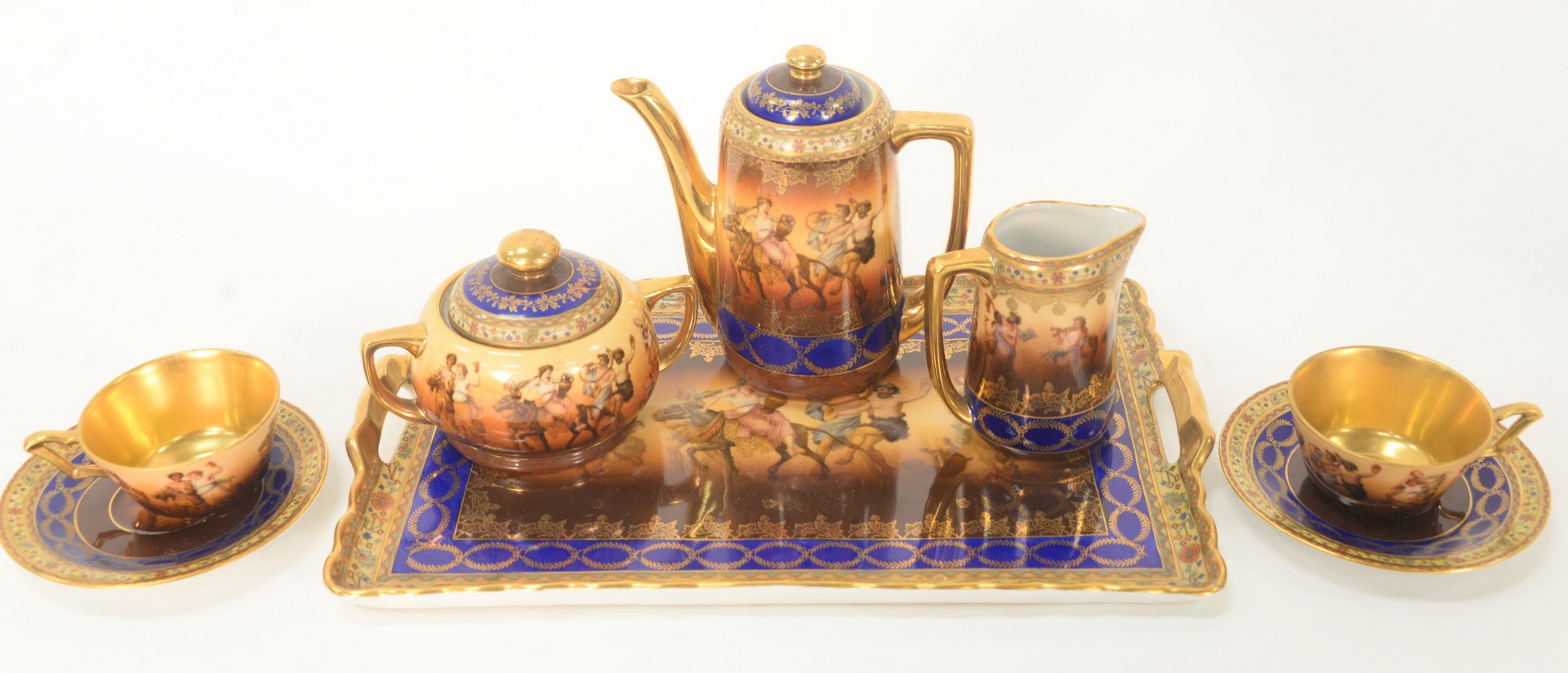 Eight Piece Group of Royal Vienna Tea Set, to include a serving tray; two cups; two saucers; one sugar; one creamer; along with a teapot, each marked to the underside, height of tea pot 5 1/2 inches, width of tray 12 inches.
