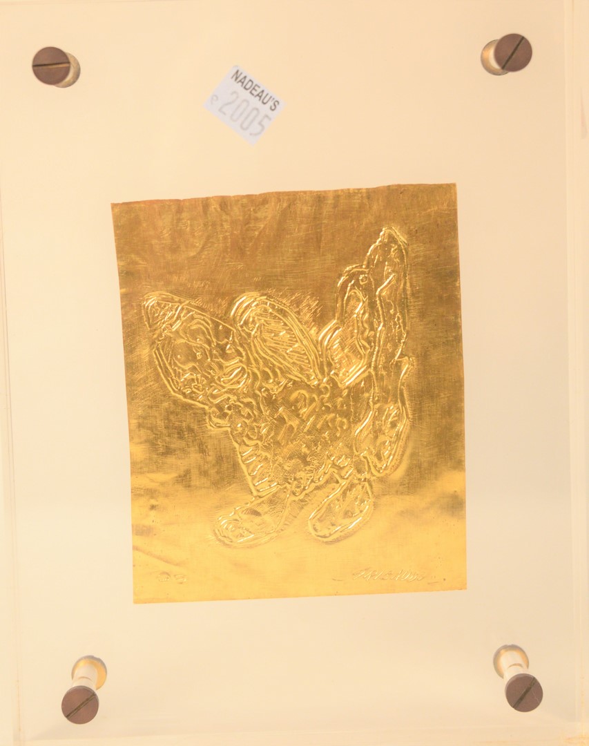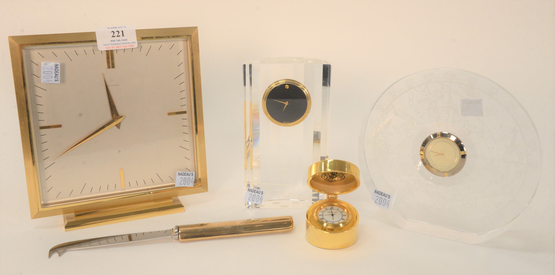 Five Piece Group, to include Movado crystal clock; square Baltman brass and glass 8-day clock; Hoya glass clock; brass Hamilton vanity clock, height 7 1/2 inches; and a Gucci olive knife. Provenance: The Estate of Alina Roisen, Park Avenue, New York.