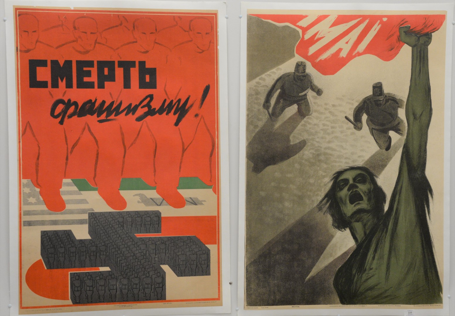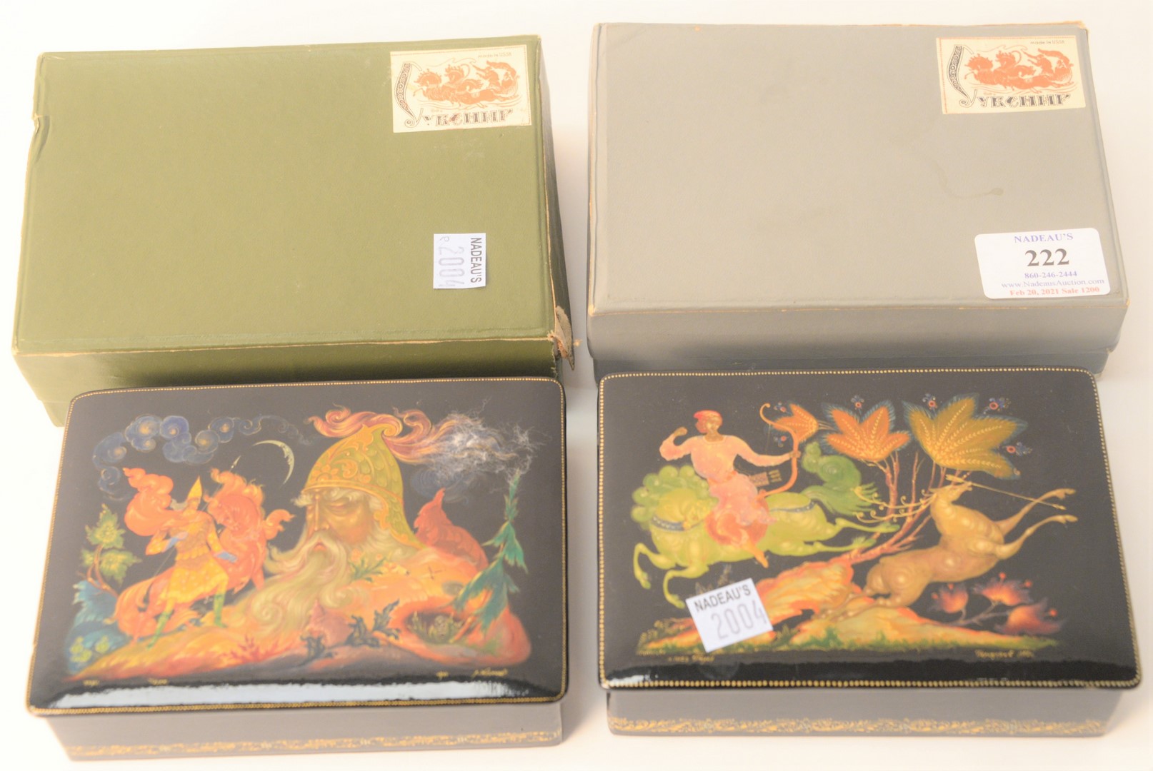 Two Russian Lacquer Boxes, having legends and fairy tale motif, manner of Palekh School, marked, signed 1979 A. Kysnaud?, and Tberozepol?, 1975; both having original boxes, marked Made in USSR Kyrehnp, tops 4″ x 6″. Provenance: The Estate of Alina Roisen, Park Avenue, New York.
