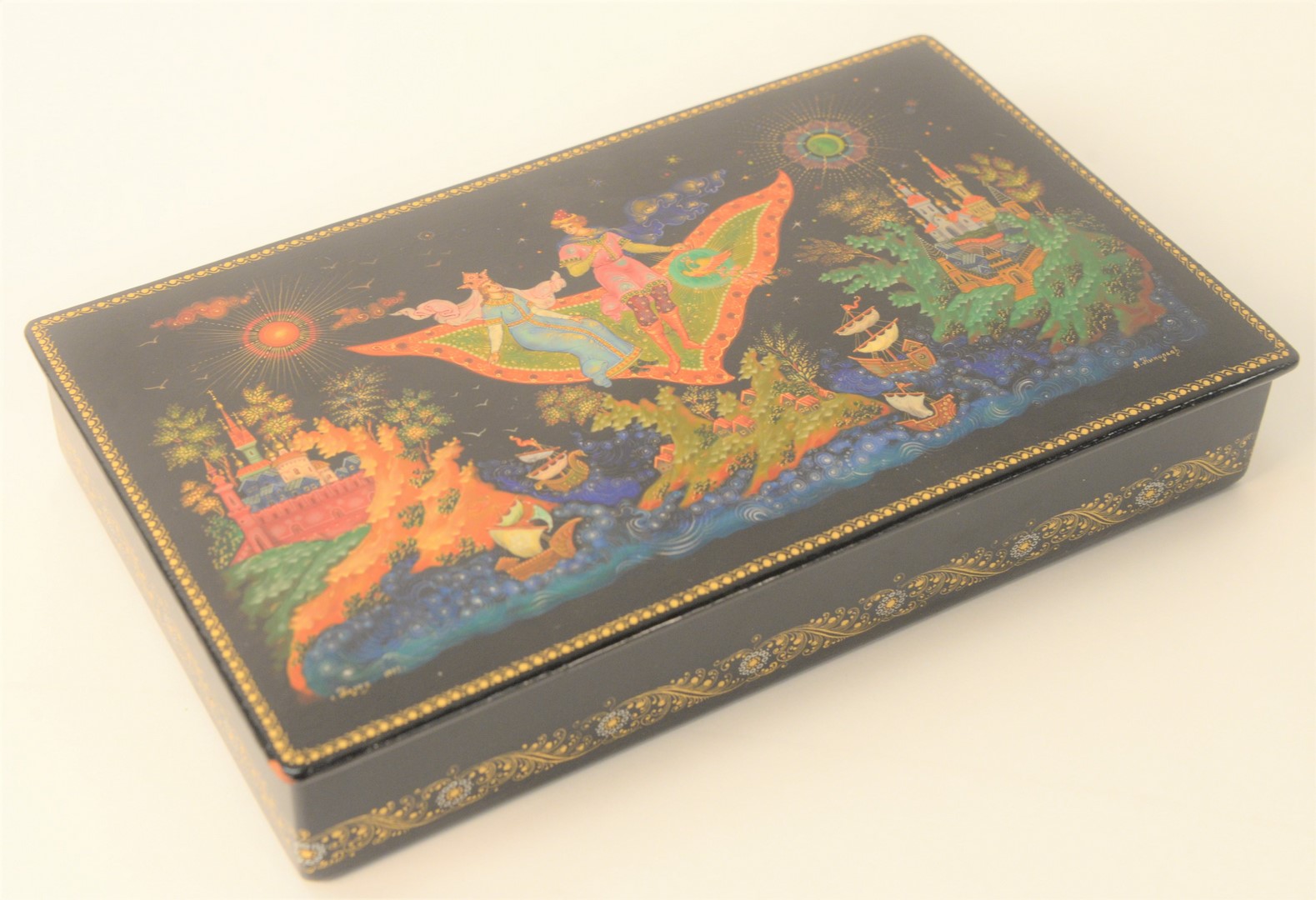 Large Russian Lacquer Box, having legends and fairy tale motif, with prince and princess, castles, and ships, manner of Palekh School, marked 1992, signed illegibly, 5 1/2″ x 9 1/2″. Provenance: The Estate of Alina Roisen, Park Avenue, New York.