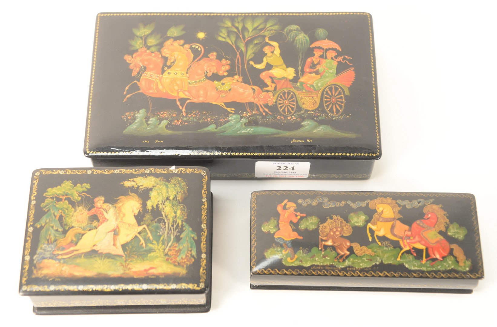 Three Russian Lacquer Boxes, having legends and fairy tale motif, manner of Palekh School, one with horses and carriage, marked 1874, one having galloping horse with two figures (prince and princess), marked 1953, signed illegibly; along with a rectangle having three horses, marked Komek, signed illegibly, height 1 1/4 inches, largest 4 3/4″ x 8″. Provenance: The Estate of Alina Roisen, Park Avenue, New York.