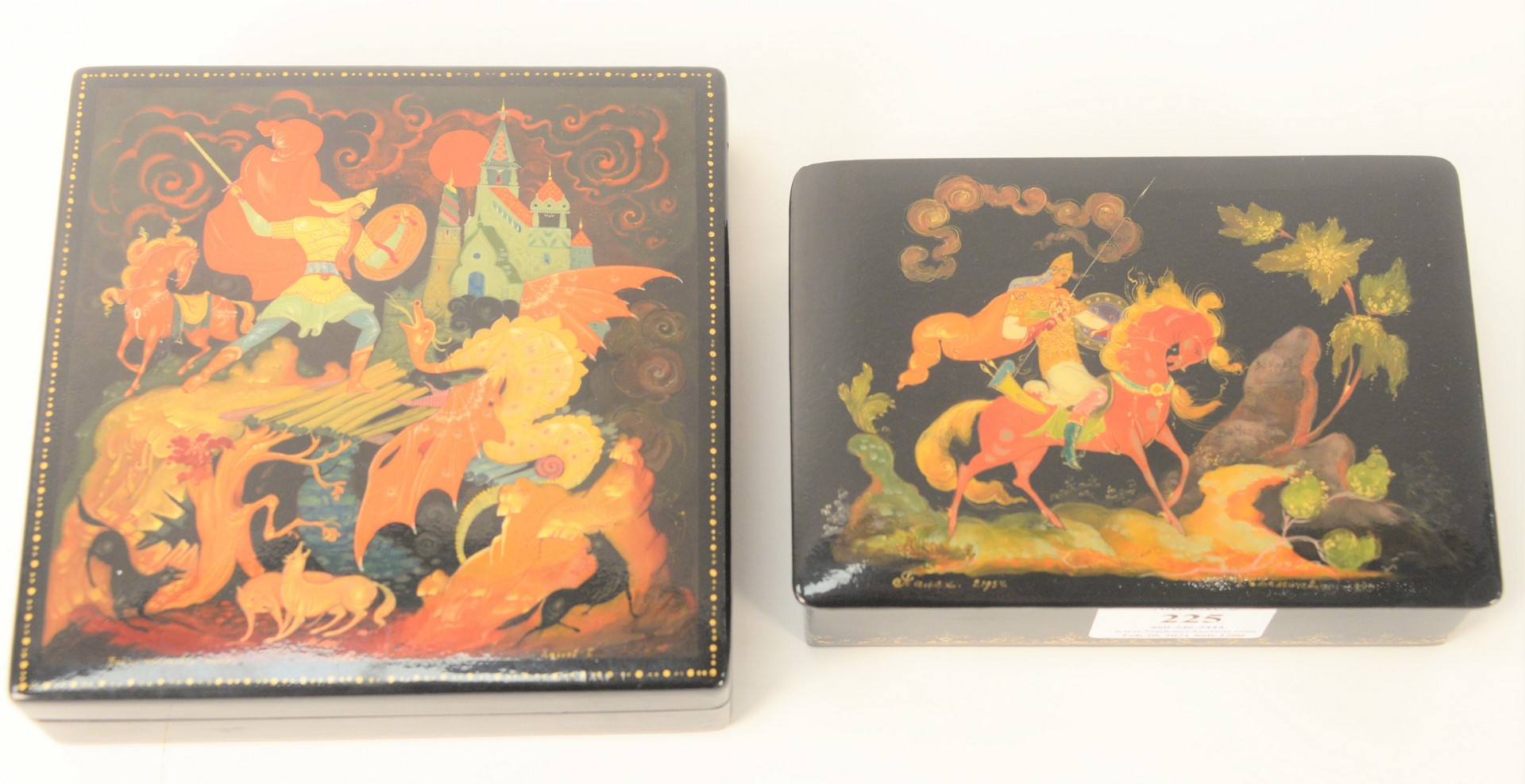 Two Russian Lacquer Boxes, legends and fairy tale motif, in the manner of Palekh School, knight on horse, marked 1924, signed illegibly; one with castle and dragon, signed illegibly Xonyu, tops 6″ x 6″ and 4 1/2″ x 6″. Provenance: The Estate of Alina Roisen, Park Avenue, New York.