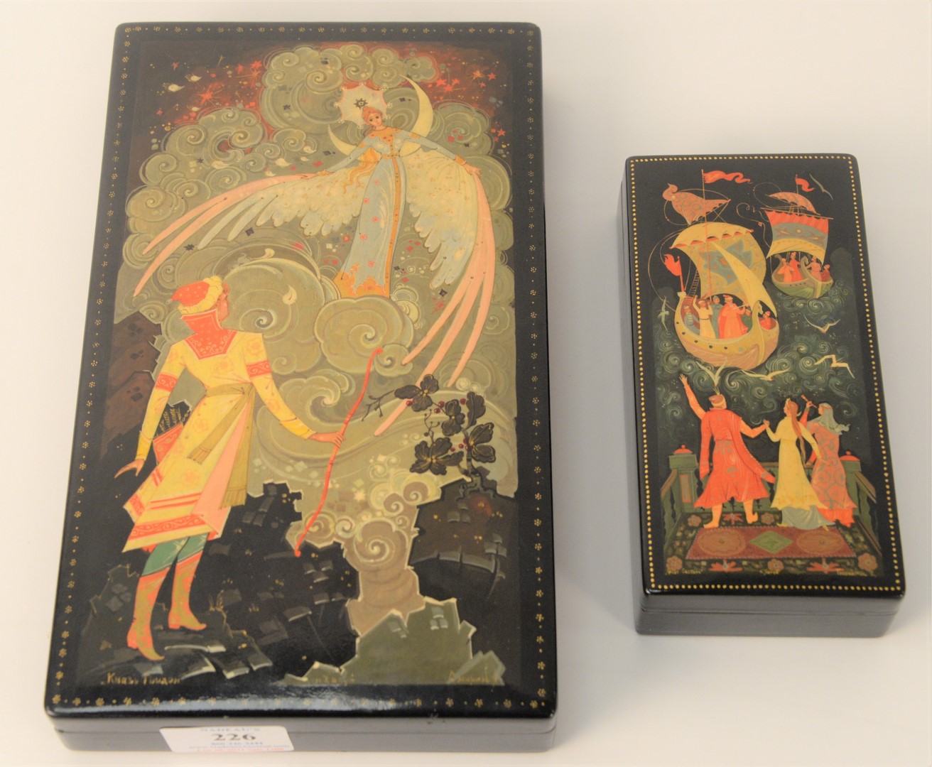 Two Russian Lacquer Boxes, legends and fairy tale motif, in the manner of Palekh School, small rectangular having sailing ships, signed illegibly on bottom; along with large rectangle with fairy, signed illegibly on bottom edge; tops 6 1/2″ x 3″ and 10 1/4″ x 6″. Provenance: The Estate of Alina Roisen, Park Avenue, New York.