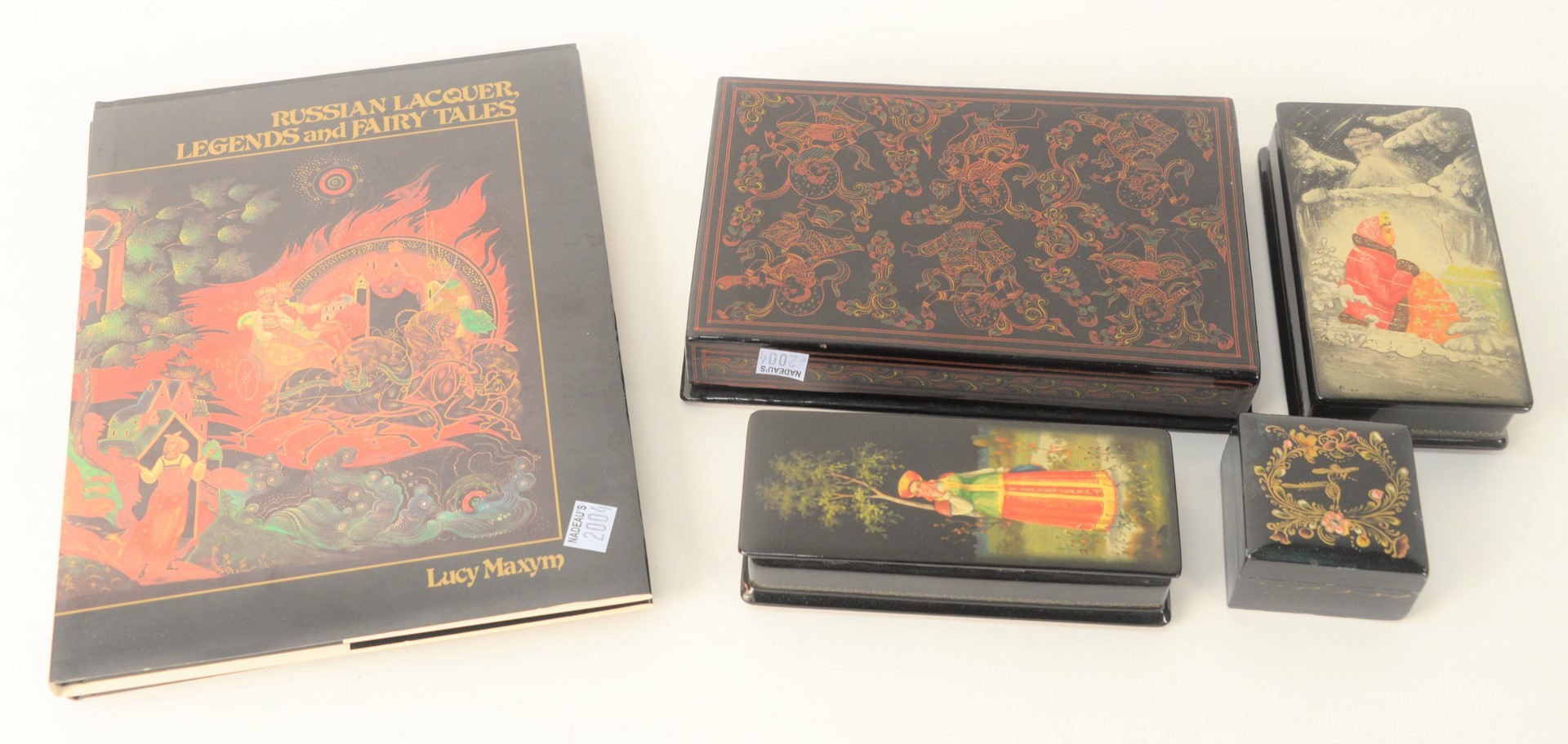 Group of Four Russian Lacquer Boxes, legends and fairy tale motif, manner of Palekh School, one marked 1924, signed illegibly; one having winter storm goddess, marked 1944, two others along with two books; largest 6″ x 9″. Provenance: The Estate of Alina Roisen, Park Avenue, New York.