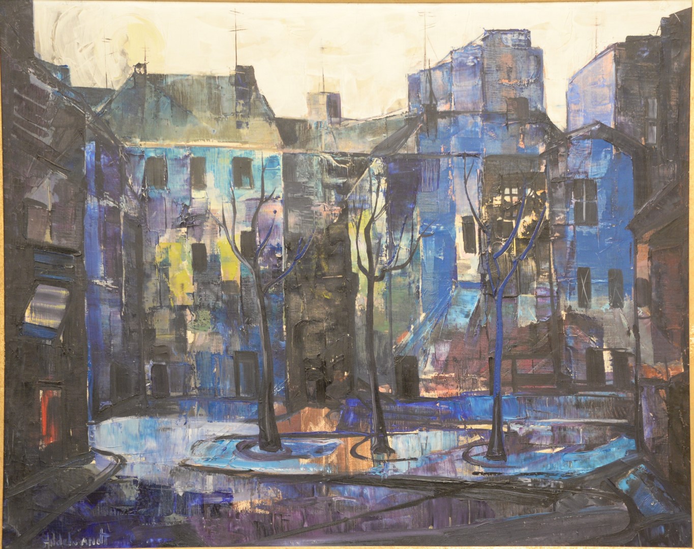 Bert Hildebrandt (Belgian, 1906 – 1974), Cityscape (No. 504), oil on canvas, signed lower left, 31 1/2″ x 39 1/2″. Provenance: The Estate of Alina Roisen, Park Avenue, New York.