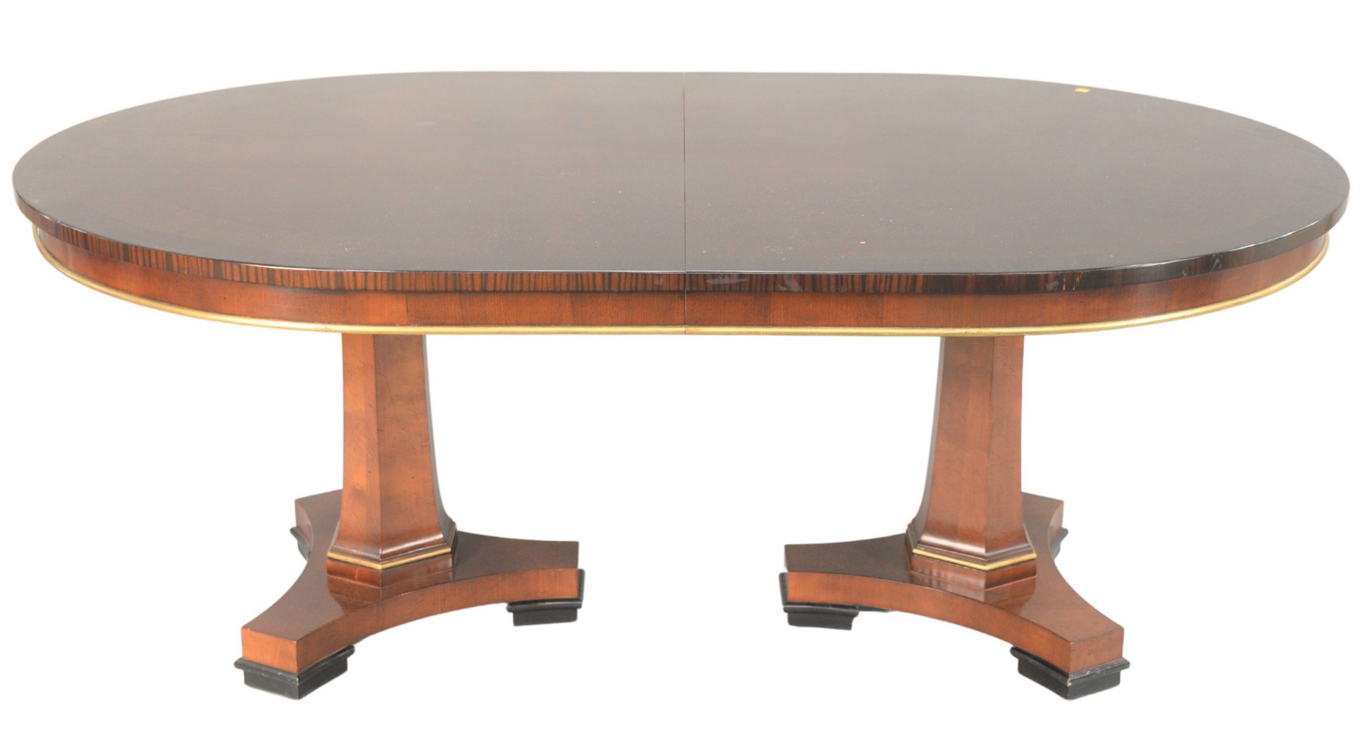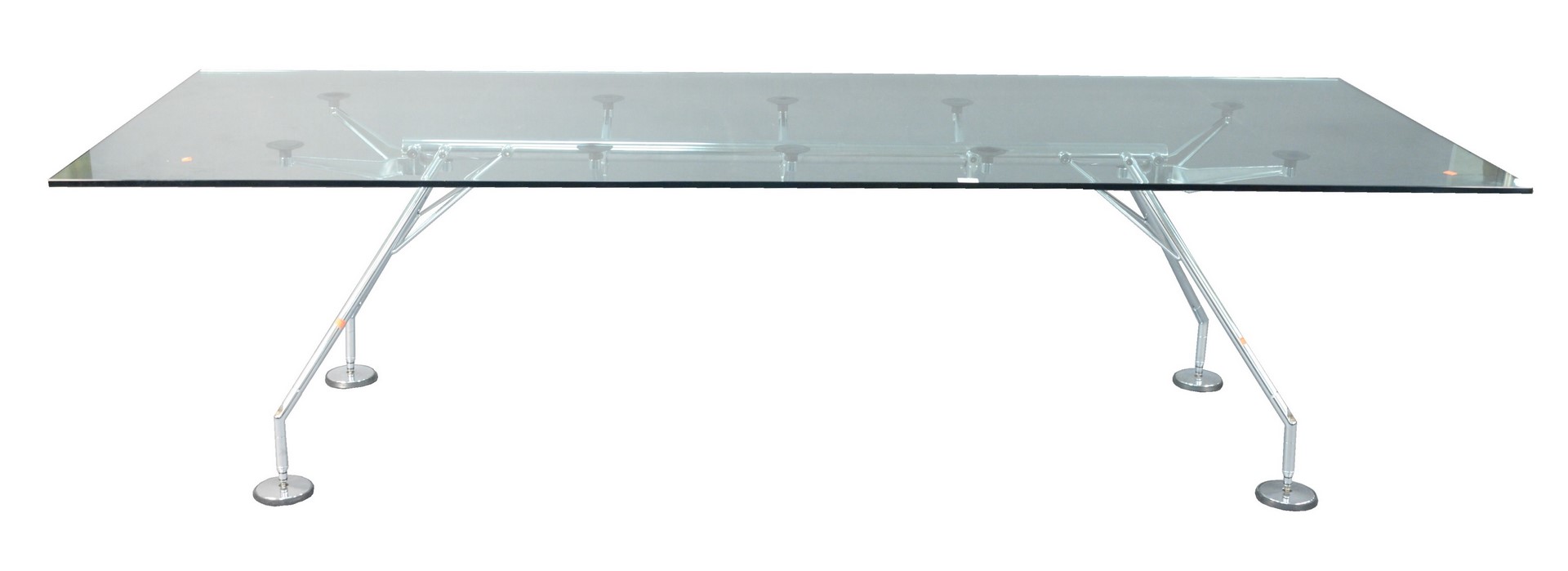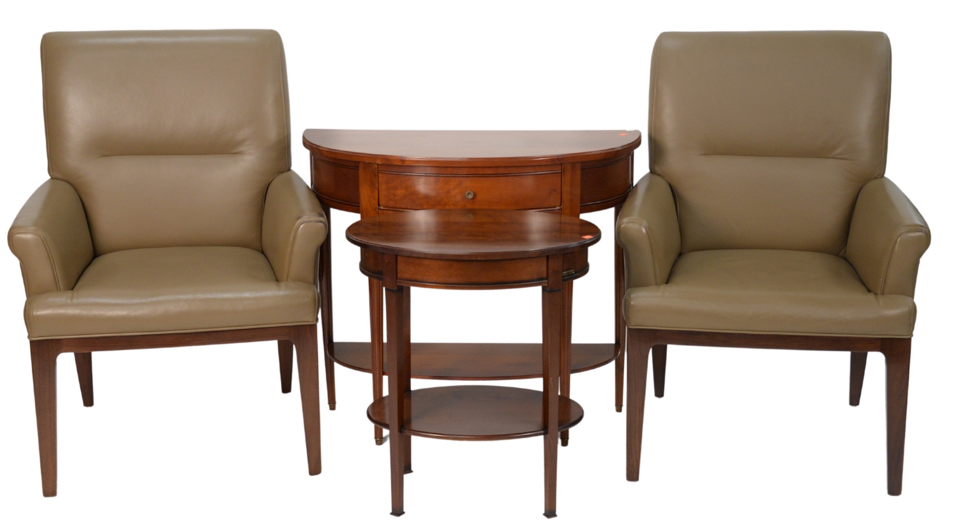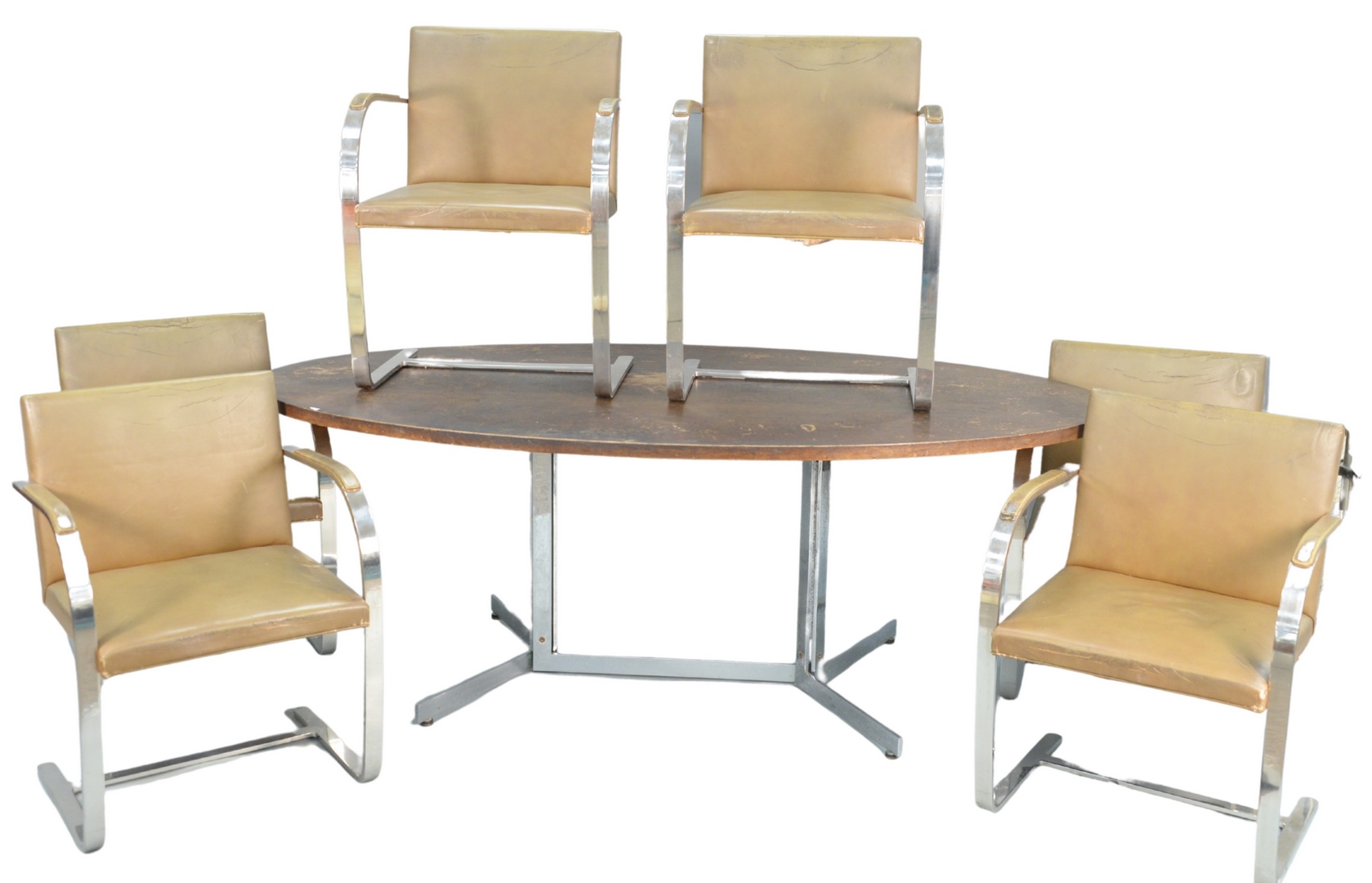 Seven Piece Knoll International Dining Set, to include six Brno chairs, designed by Mies Van Der Rohe, having chrome plated frames and leather upholstery, along with Bern oval walnut table, designed by Hans Eichenberger, on Swiss mirror chrome base (table top in need of refinishing), height 29 inches, top 42″ x 78″, open 42″ x 114″. Provenance: The Estate of Alan Gans, Mulberry Point, Guilford.