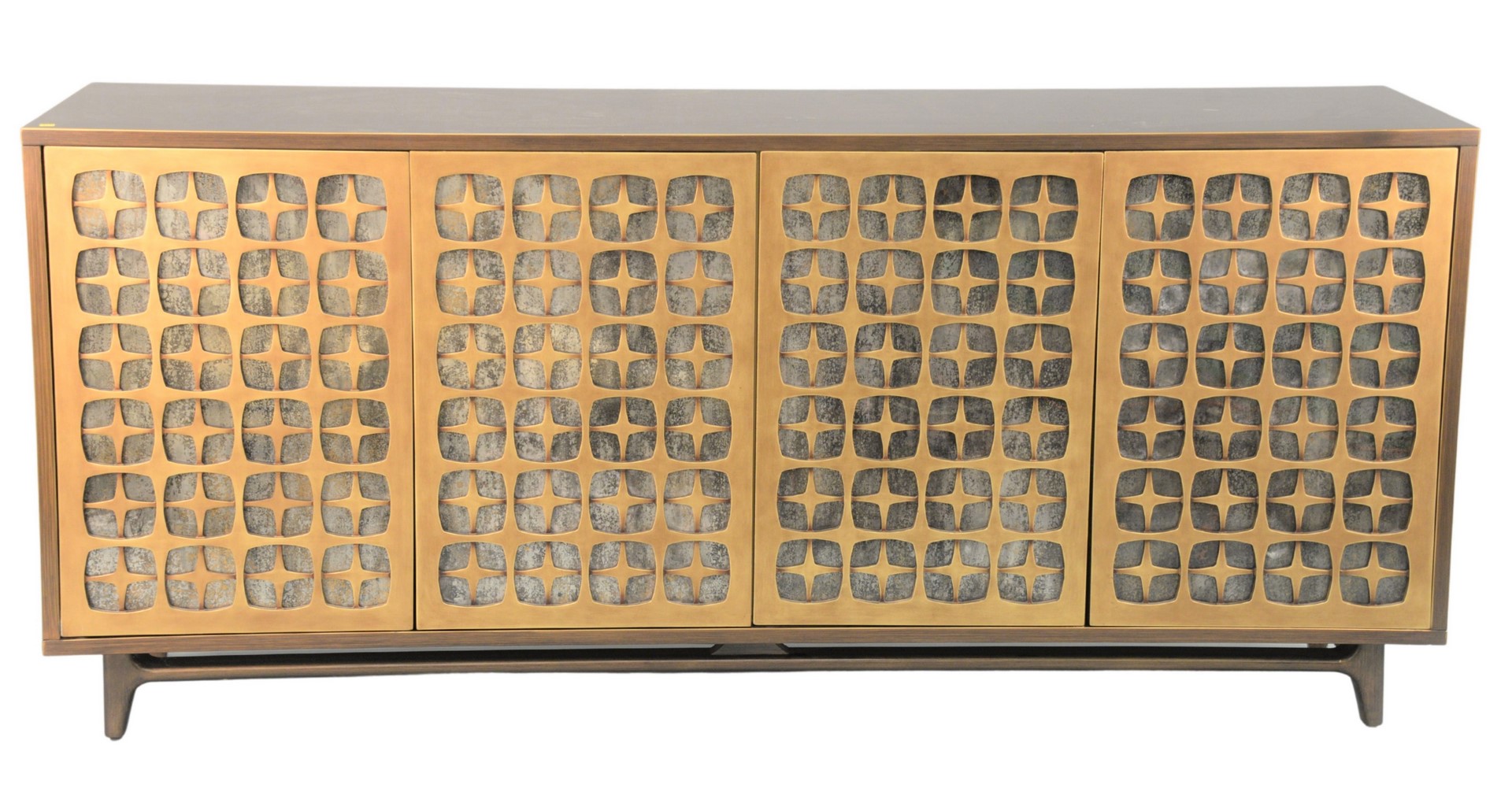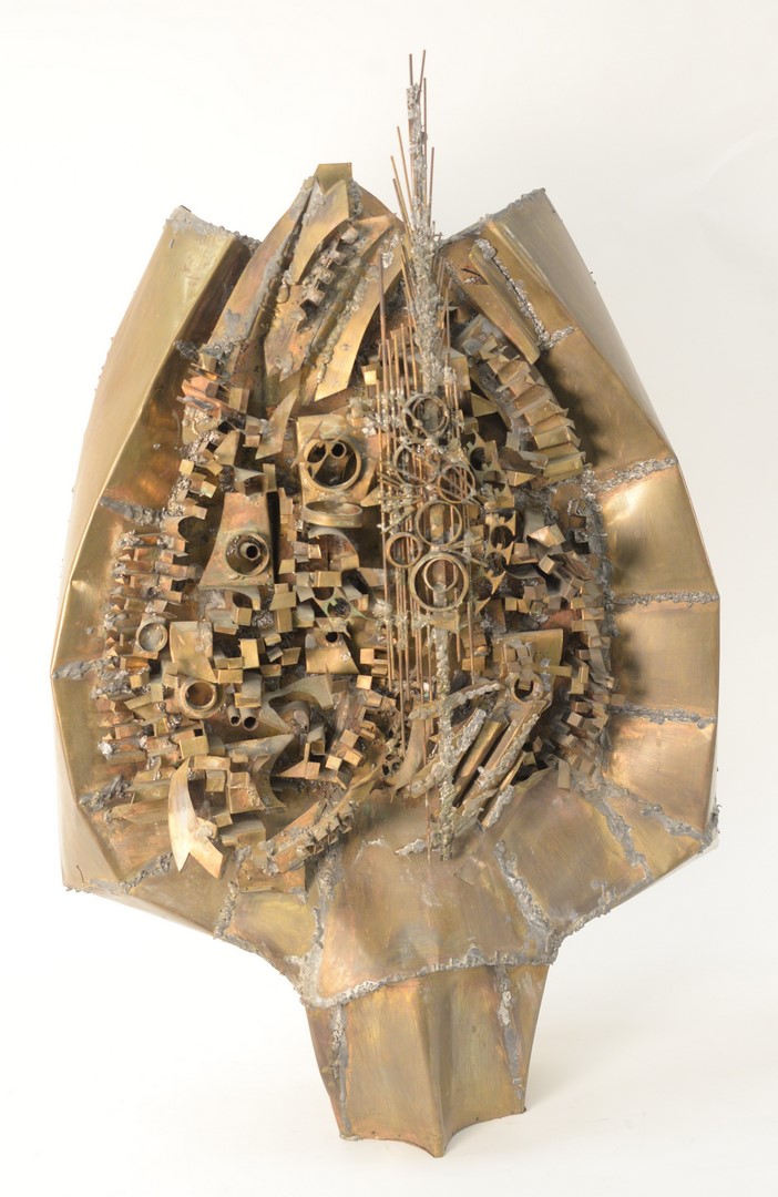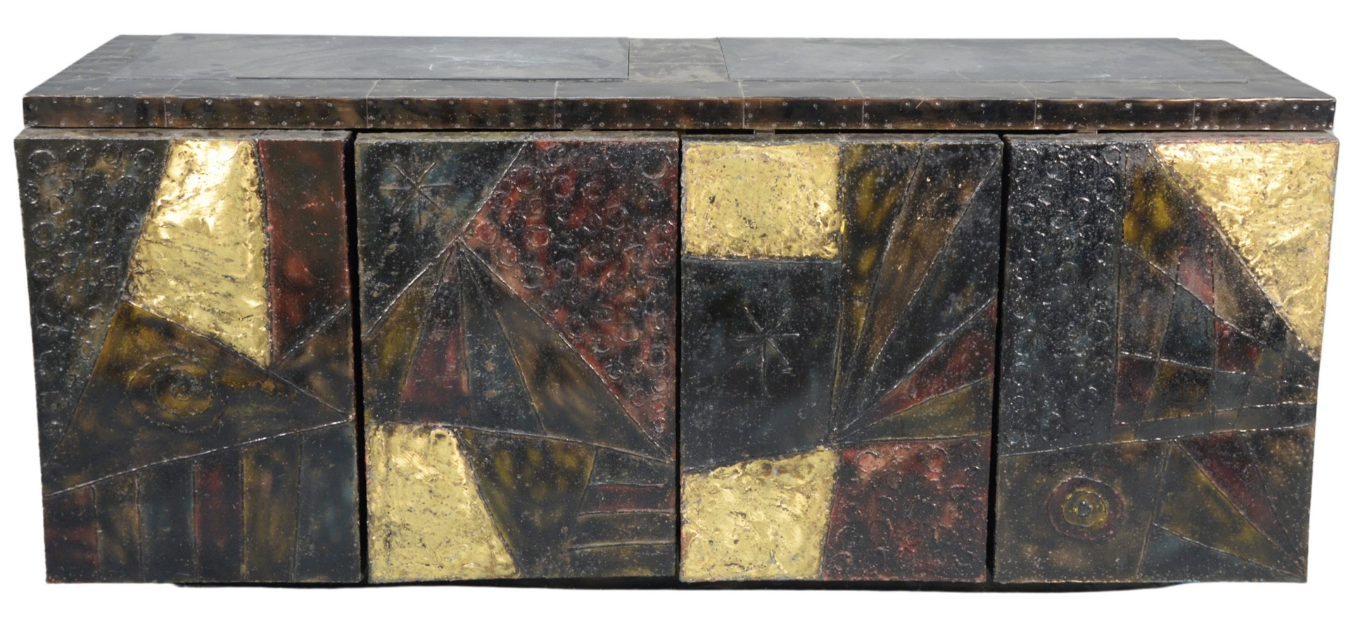 Paul Evans Patchwork Brutalist Modern Cabinet, model PE-40A, for Directional, having four welded steel doors, with poly-chromed exterior, with inset slate two-part top, signed Paul Evans 1969 under right door, height 31 1/2 inches, width 72 inches, depth 22 inches. Provenance: The Estate of Alina Roisen, Park Avenue, New York.