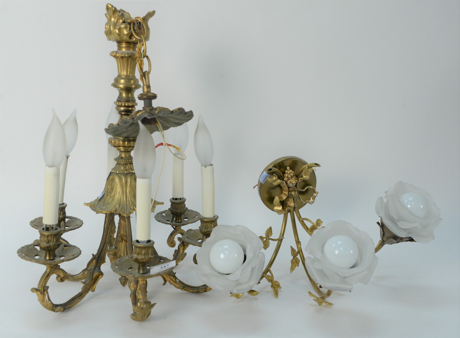 Two French Bronze Hanging Lights; bronze six light chandelier; along with bronze sconce having three lights with floral frosted shades, 7 inches and 17 inches. Provenance: The Estate of Alina Roisen, Park Avenue, New York.