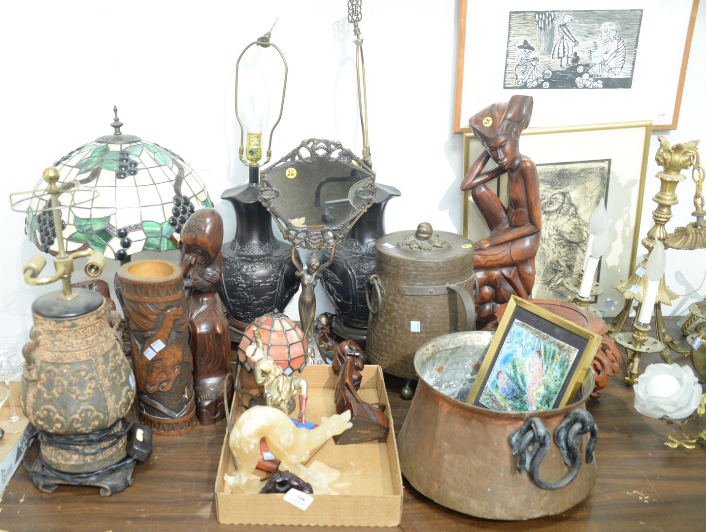Large tray lot to include; Bali Carved Wood Figure, hand hammered copper pot, made in Italy; three Oriental lamps; carved figures; small boudoir lamp; etc. Provenance: The Estate of Alina Roisen, Park Avenue, New York.