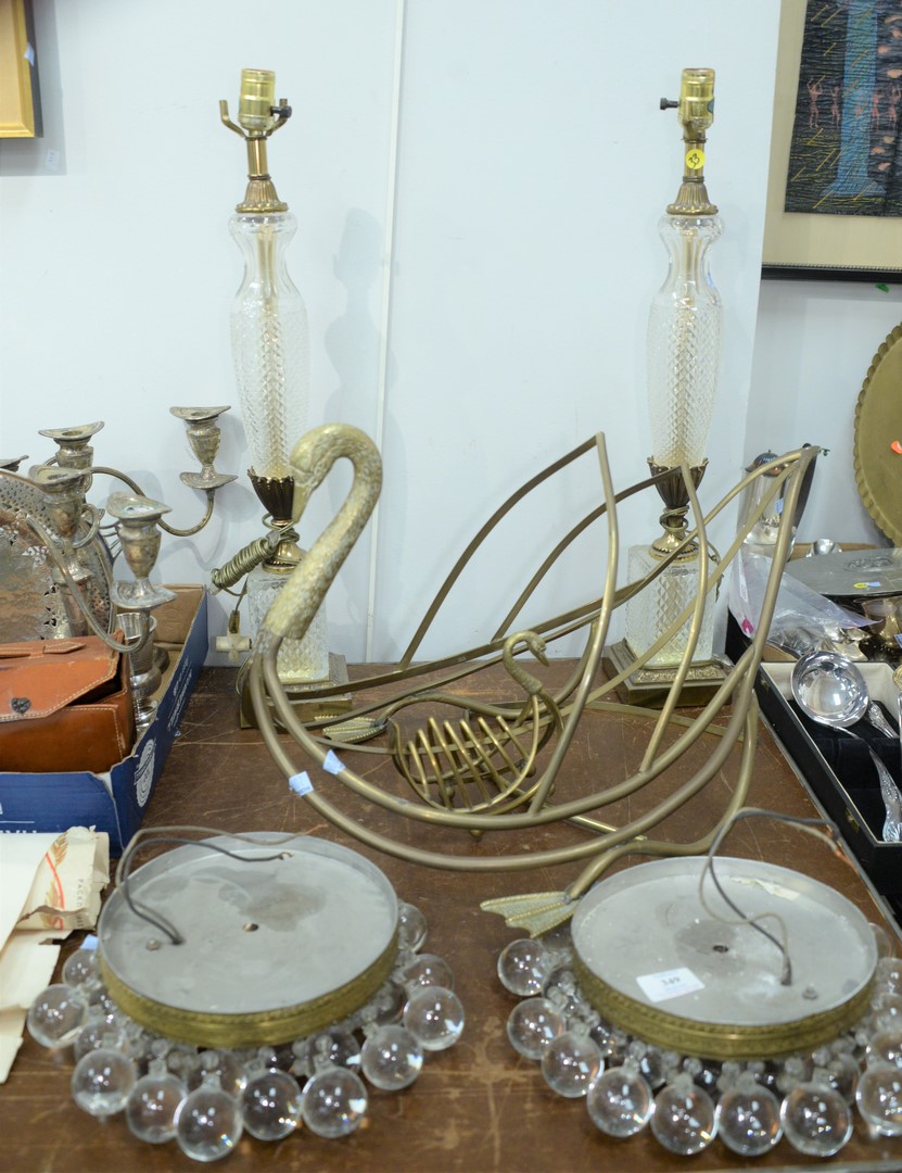 Pair of Mid-Century Ceiling Lights, with glass ball shades, diameter 8 1/2 inches; along with a pair of table lamps, height 26 inches; brass swan magazine rack, length 23 inches. Provenance: The Estate of Alina Roisen, Park Avenue, New York.