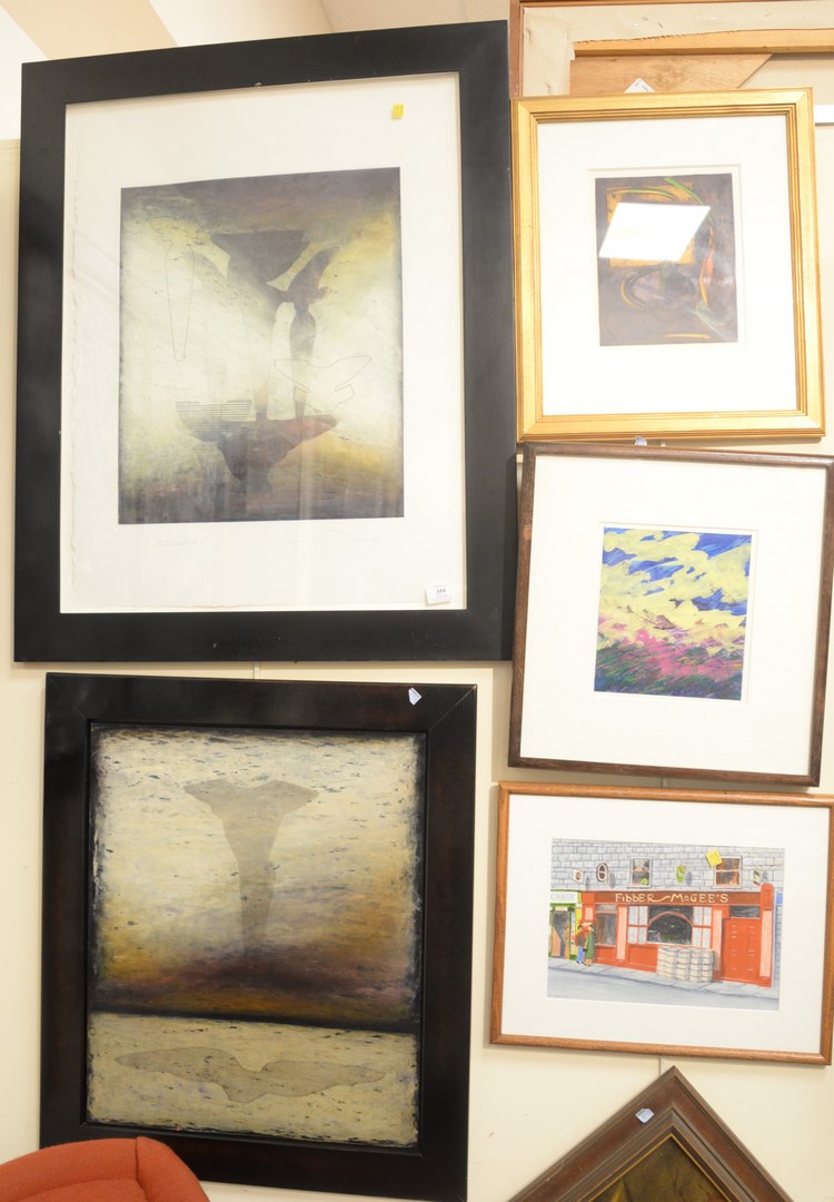 Group of Seven Contemporary Paintings to include J. Magee, watercolor, store front; Bennie Birkert?, abstract watercolor; Mary Schaefer Reynolds, “Float on the Water”, colored engraving; “Still Life with Window”, signed illegibly; chicken’s, unsigned; two oil abstracts, signed illegibly, “Sovereign” and “Threshold” on Aquarelle Arches paper; largest sight size 20″ x 18″.