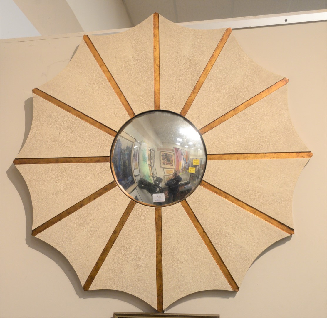 Faux Shagreen Star Form Mirror, small round convex mirror having faux shagreen panels and gold painted border frame, similar to Ria and Youri Augousti, diameter 37 1/2 inches.