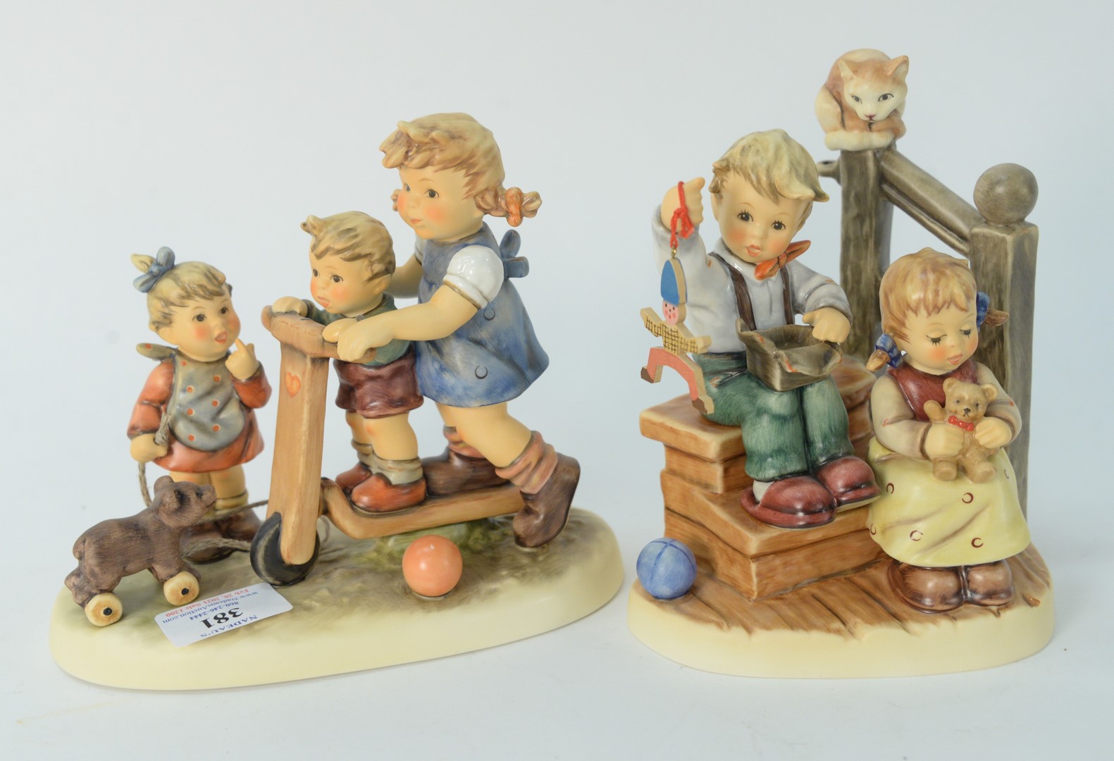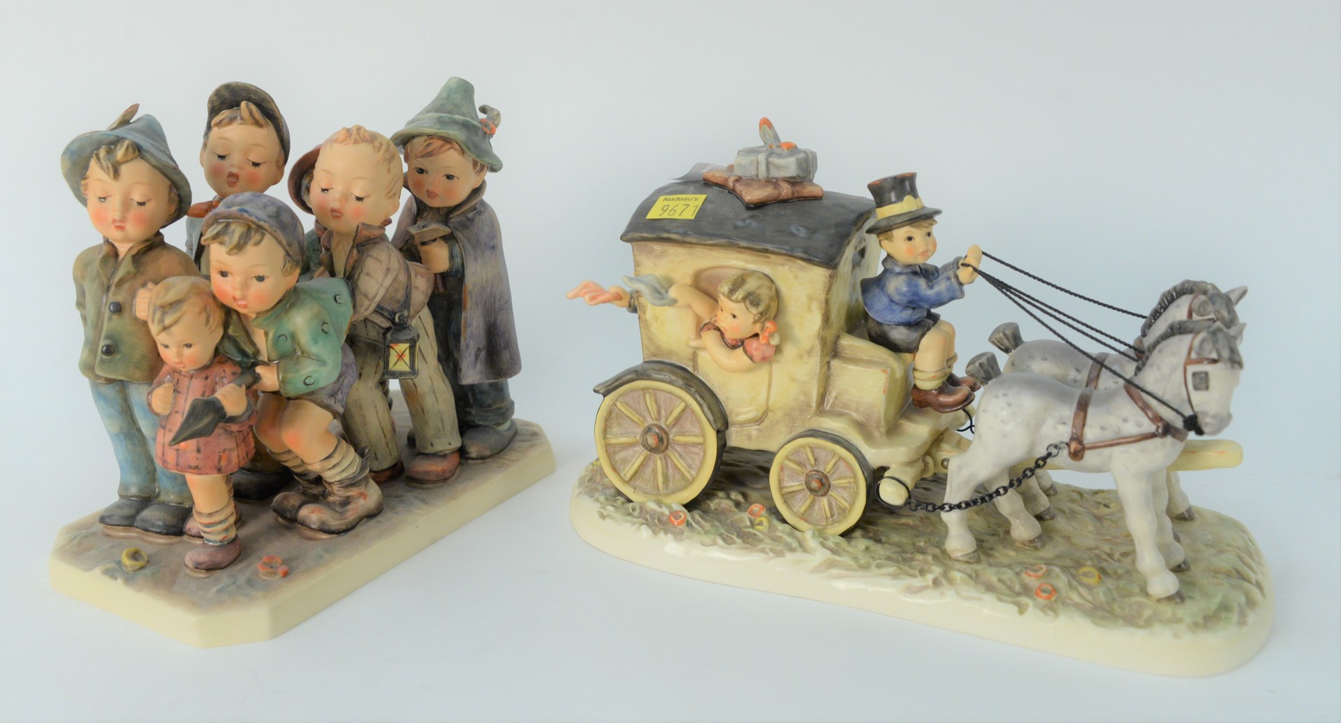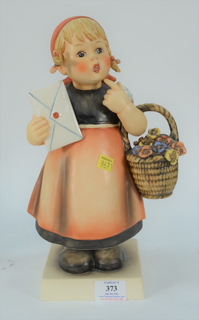 Pair of Hummel’s, to include ‘Adventure Bound’, and ‘Mail is Here’, each inscribed along the base and arked to the underside, heights 7 1/4 inches and 5 1/2 inches.