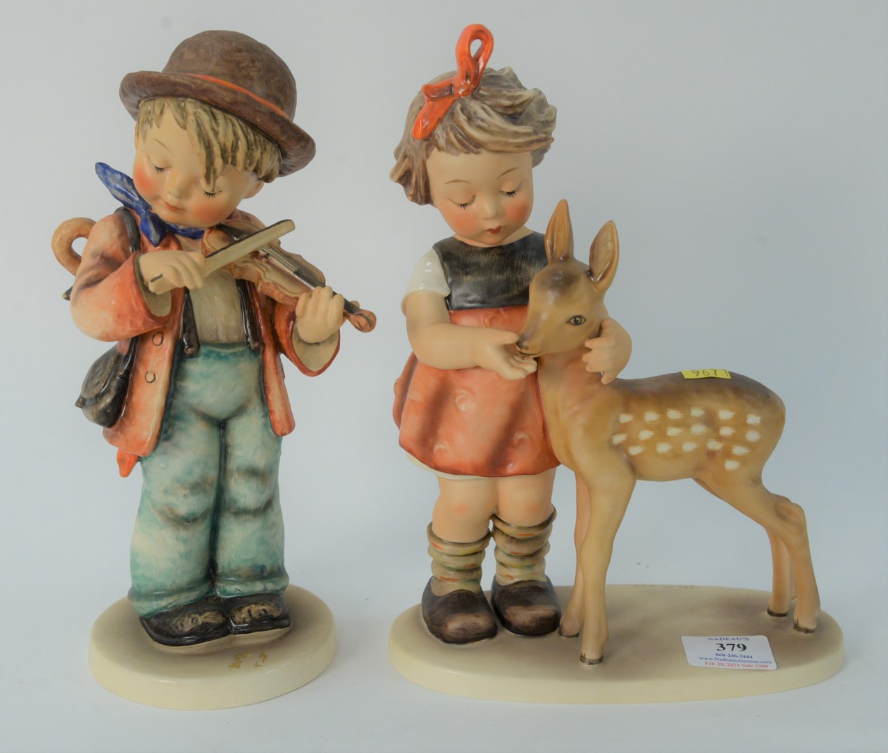 Pair of Large Hummel’s, to include ‘Little Fiddler’ and ‘Friends’, each marked to the underside and inscribed on the base, heights 11 inches and 10 1/2 inches.