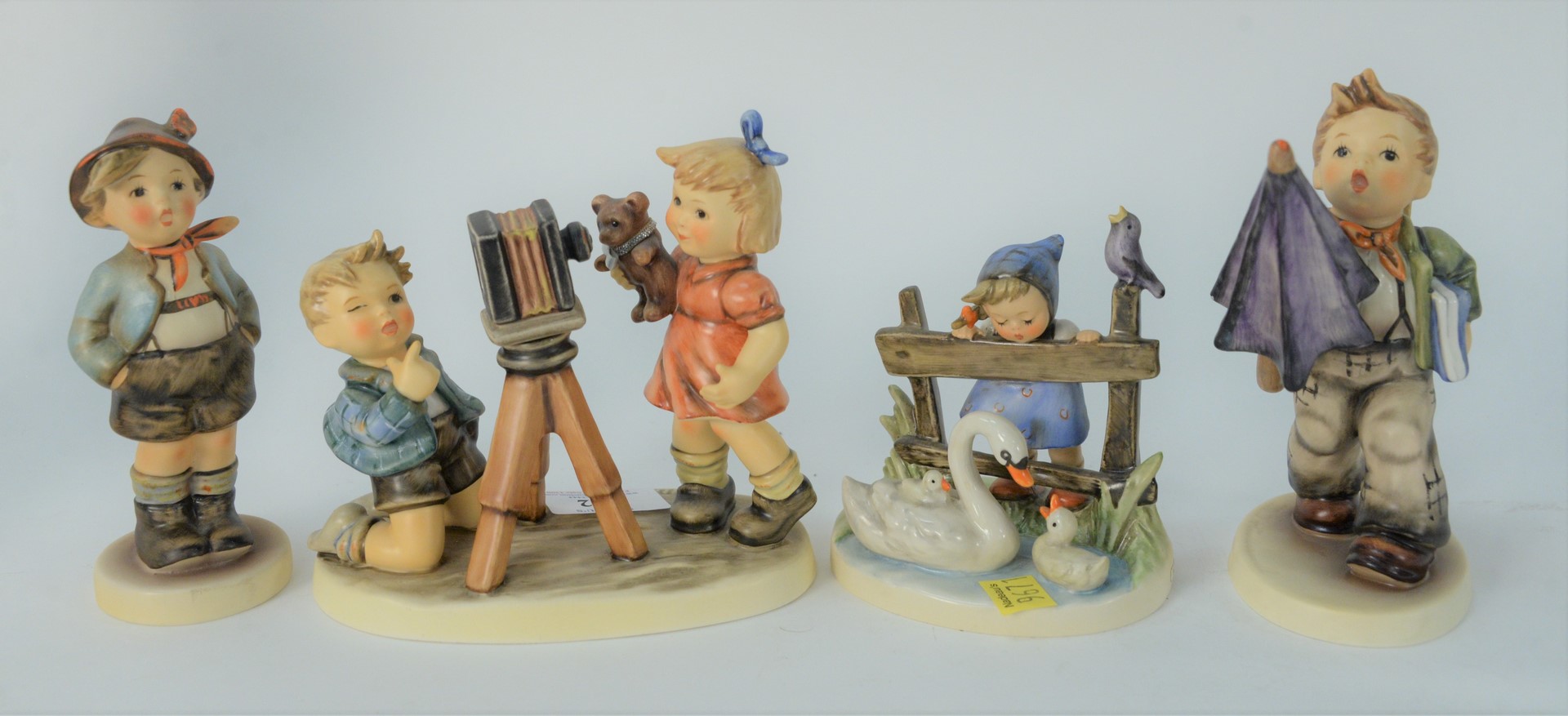 Group of Four Small Hummel’s, to include ‘Is It Raining?’; ‘Feathered Friends’; ‘Camera Ready’; along with one small boy, each marked to the underside, heights ranging from 4 inches to 5 1/2 inches.