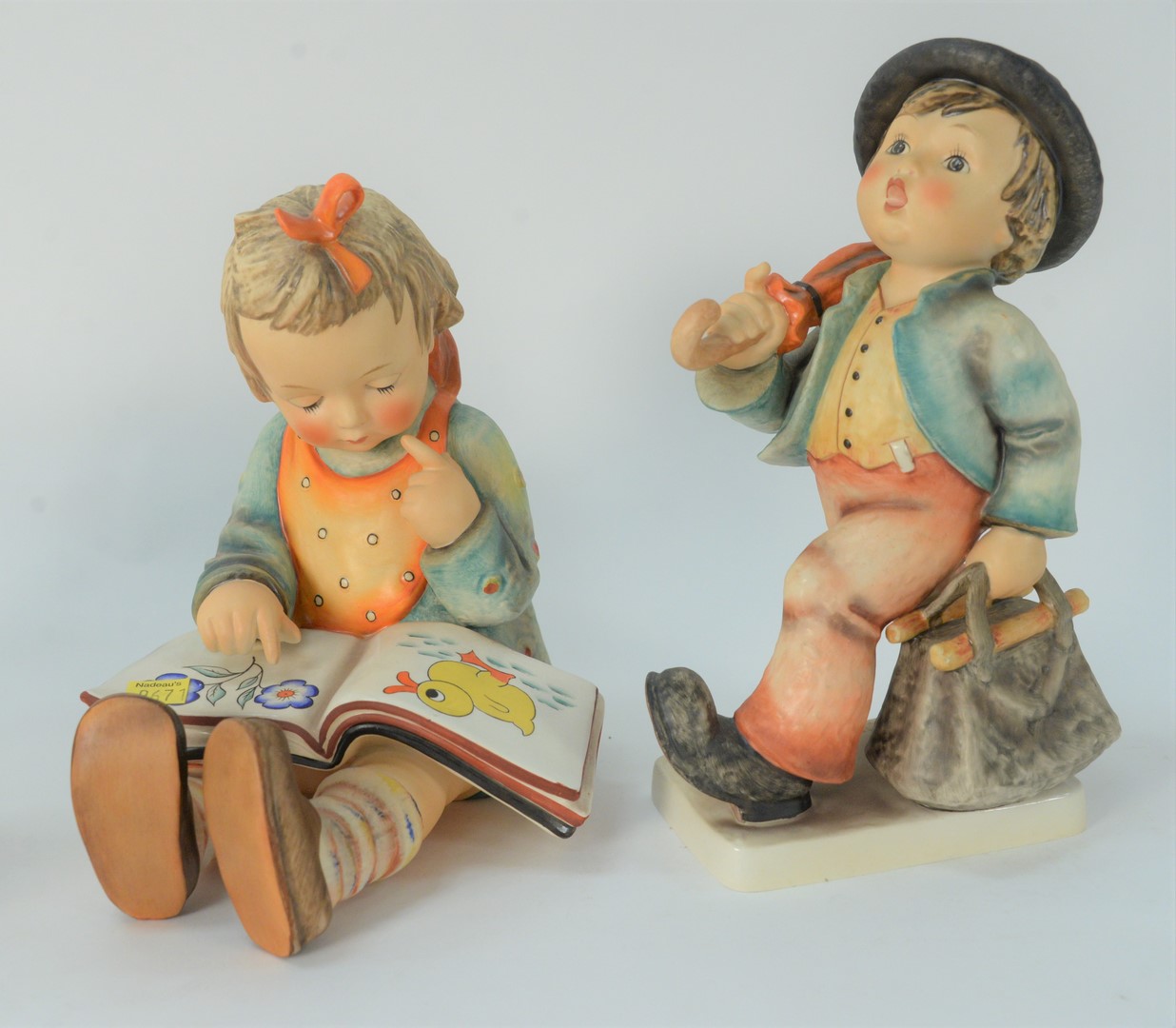 Pair of Large Hummel’s, to include ‘Bookworm’ and ‘Merry Traveler’, each inscribed along the base and marked to the underside, heights 8 1/2 inches and 9 1/2 inches.