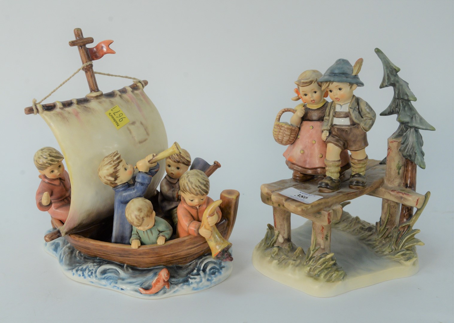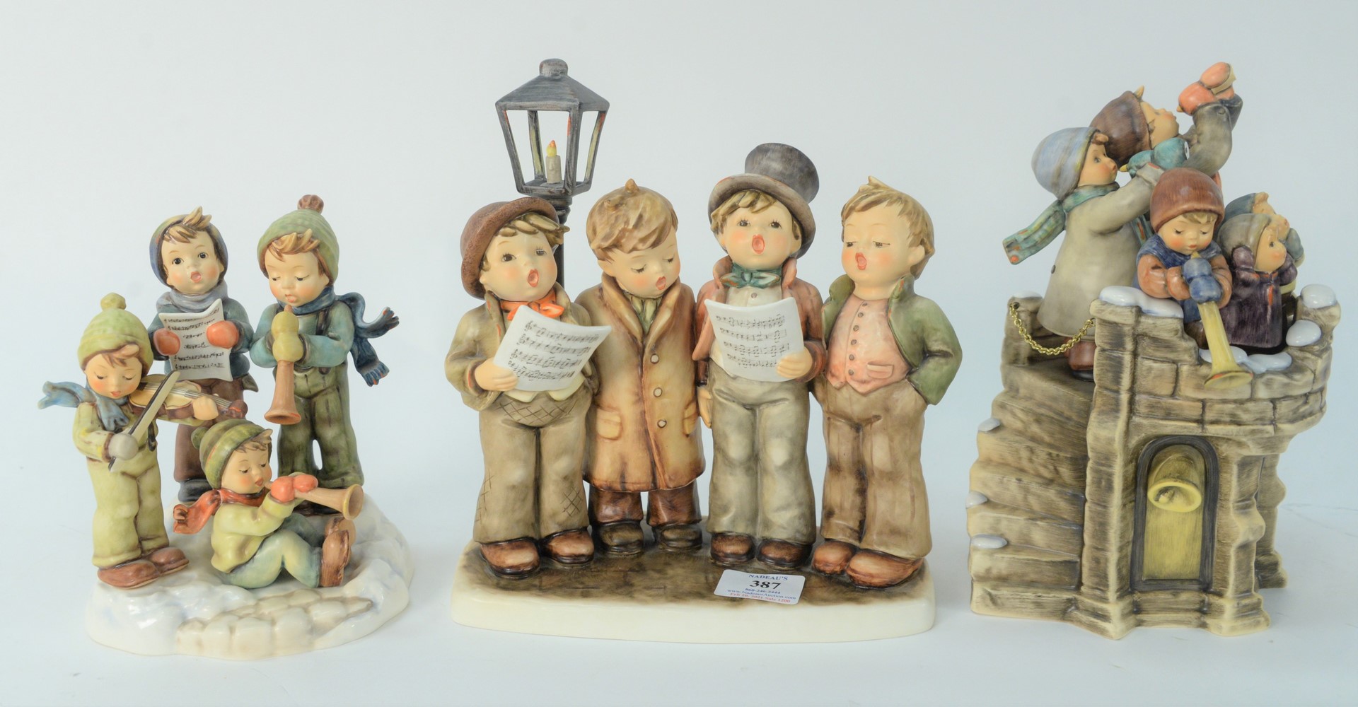 Three Hummel’s, to include ‘Fanfare’, ‘Harmony in Four Parts’,’Strike Up the Band, 1995′ , (Fanfare and Harmony having broken pieces), each marked to the underside, two inscribed along the base, heights ranging from 9 1/2 inches to 7 1/2 inches.