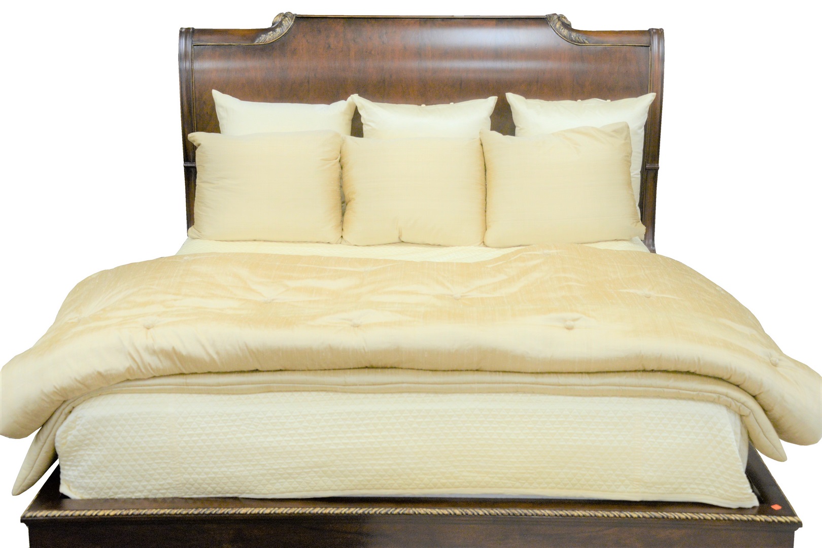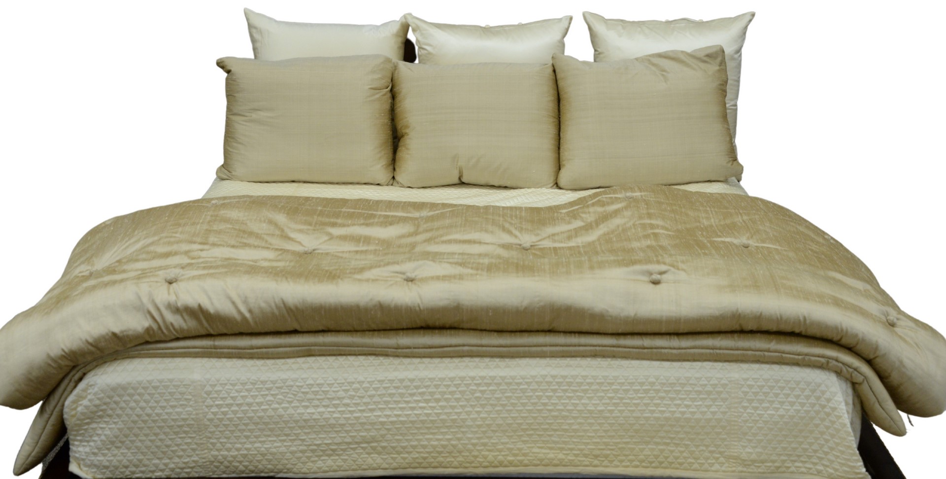 Two Sets of Quilts and Coverlets, from Ann Gish, to include coverlet quilted charmeuse, king size in ivory, $840 new; along with king French knot coverlet in mica duplone, $1,400, and six pillows, etc. Retail for all pieces $4,000.