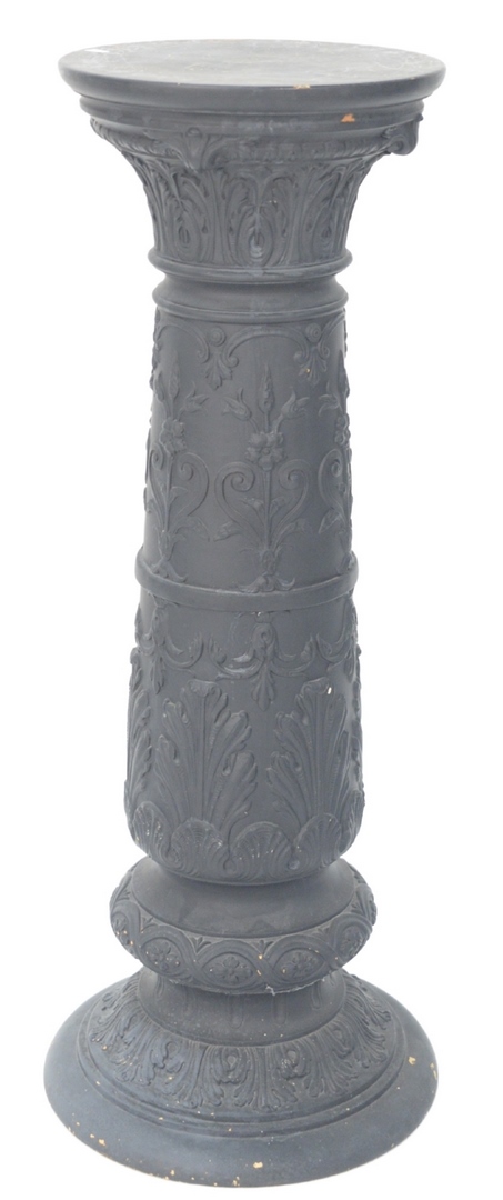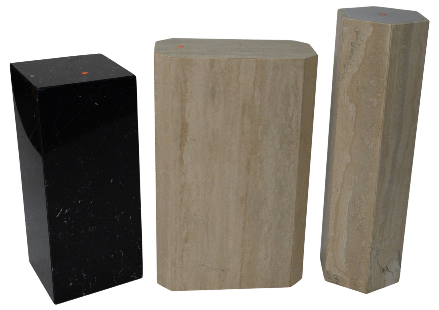 Three Granite Pedestals, one with light-up top, height 36 inches, diameter 10 1/4 inches; black granite top 12″ x 12″ x 28 1/2″, has small crack, tan height 31 3/4 inches, top 9 1/2″ x 19 3/4″.