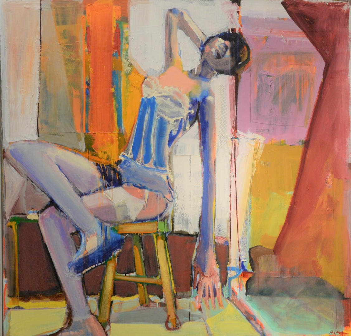 Richard Hickam (American, b. 1944), Dressing Room, acrylic on canvas, signed lower right Hickam, titled and signed verso, Allen Stone Galleries stamp verso, 60″ x 62″.