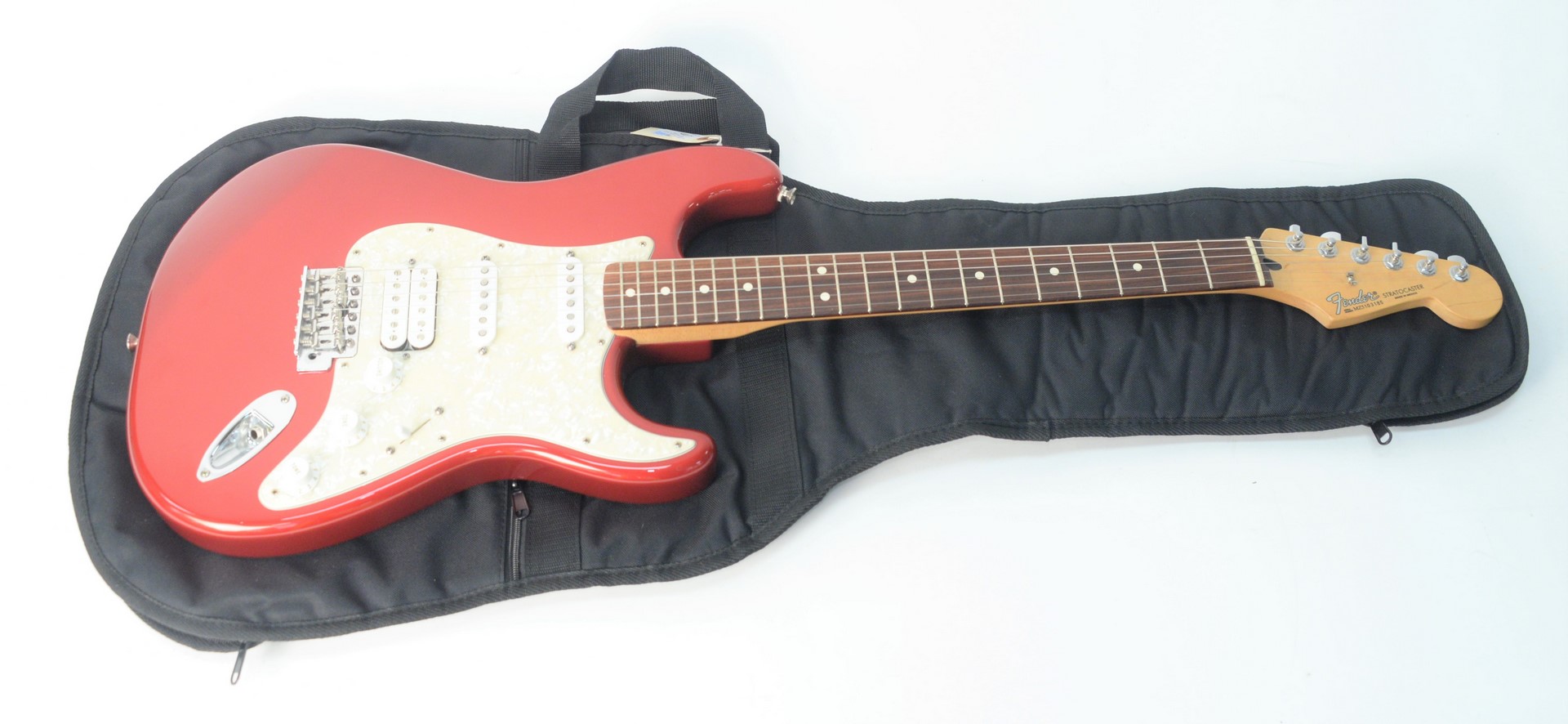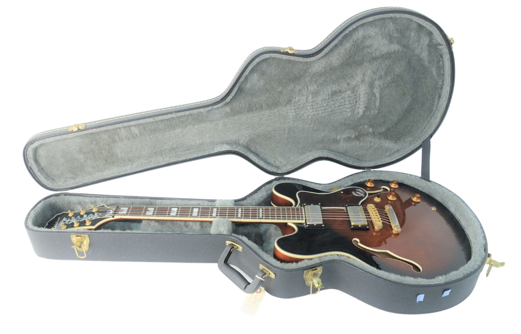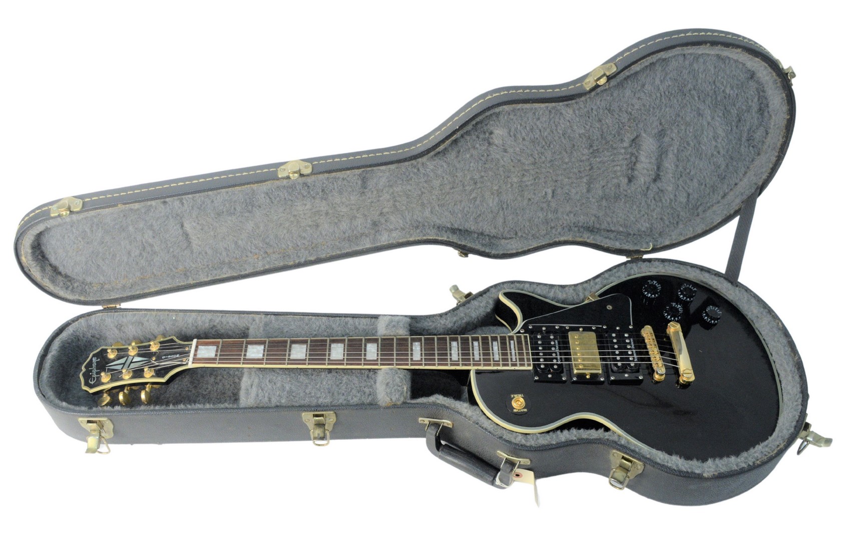 2004 Epiphone Les Paul Guitar, serial # I1401059, three pick-up model, two Seymour Duncan bridge and neck, middle humbucker, with hard-shell case, length 30 1/2 inches.
