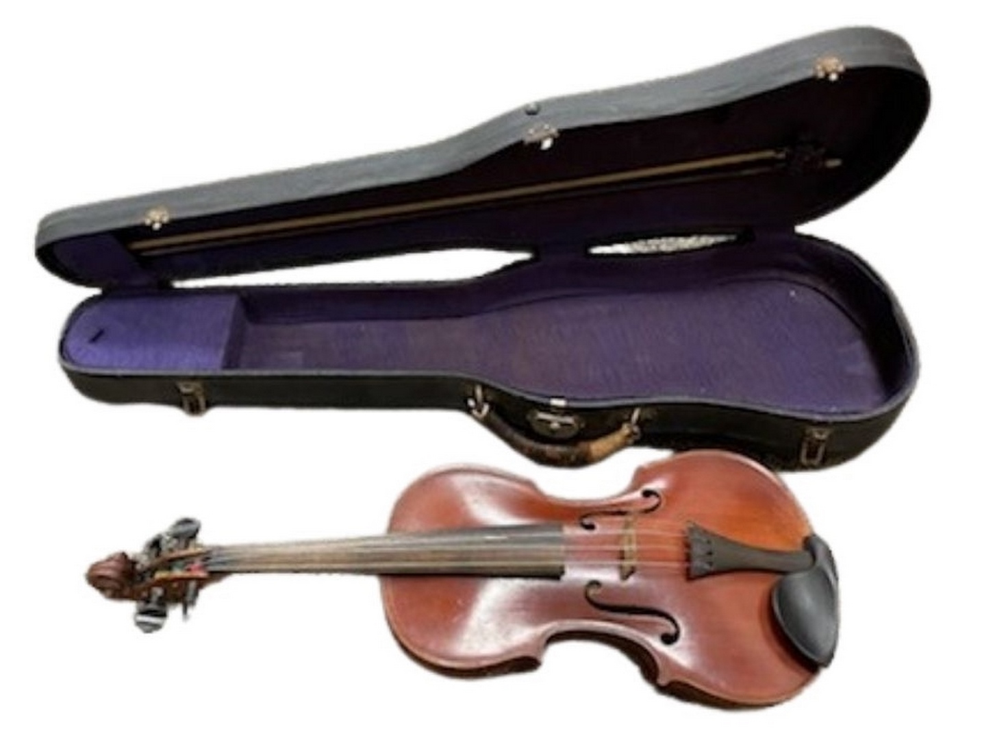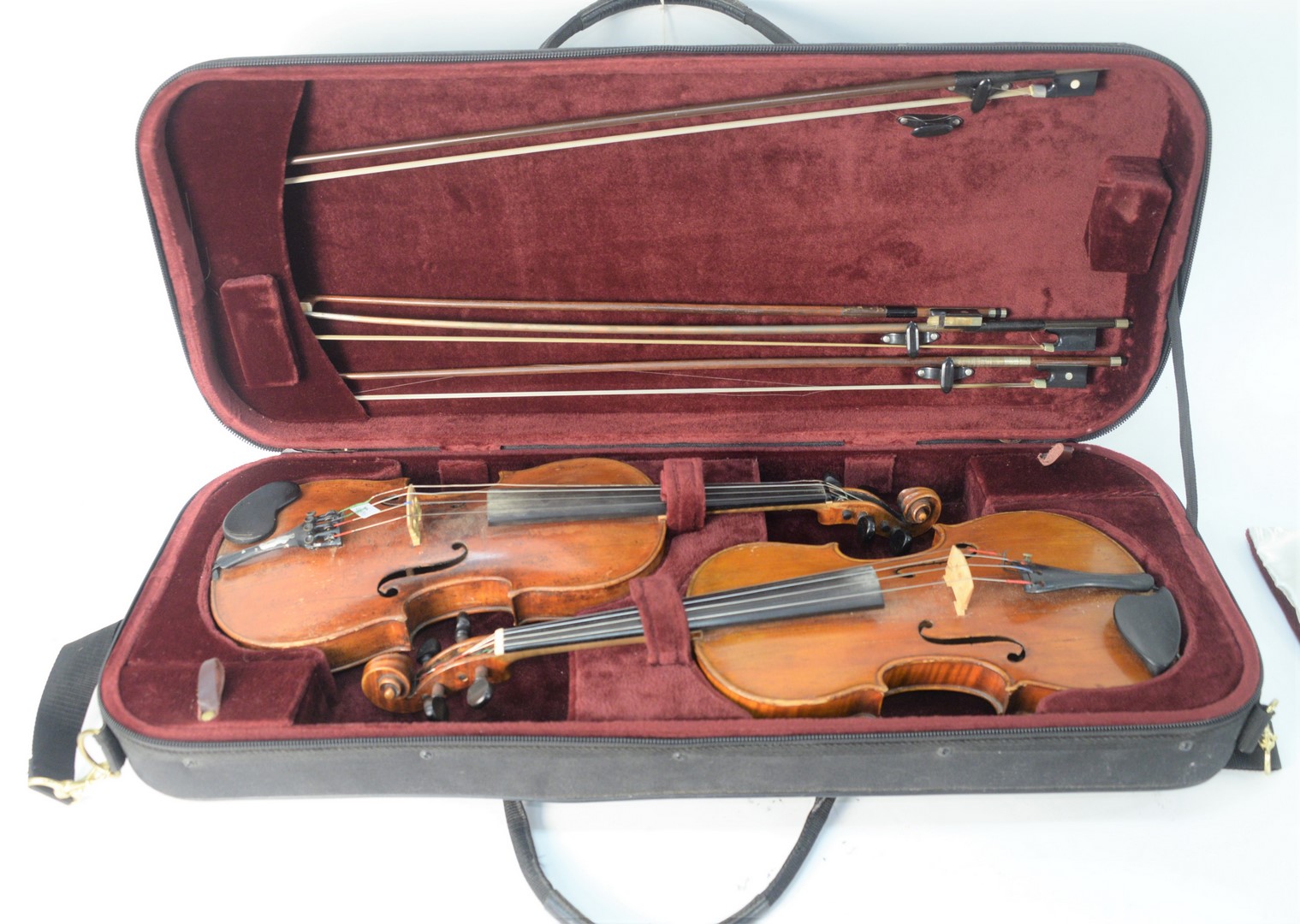 Two Student Violins, together with four bows, one labeled Glasser, one signed Amati Pestini, all encased in one soft shell travel case, case length 33 inches.