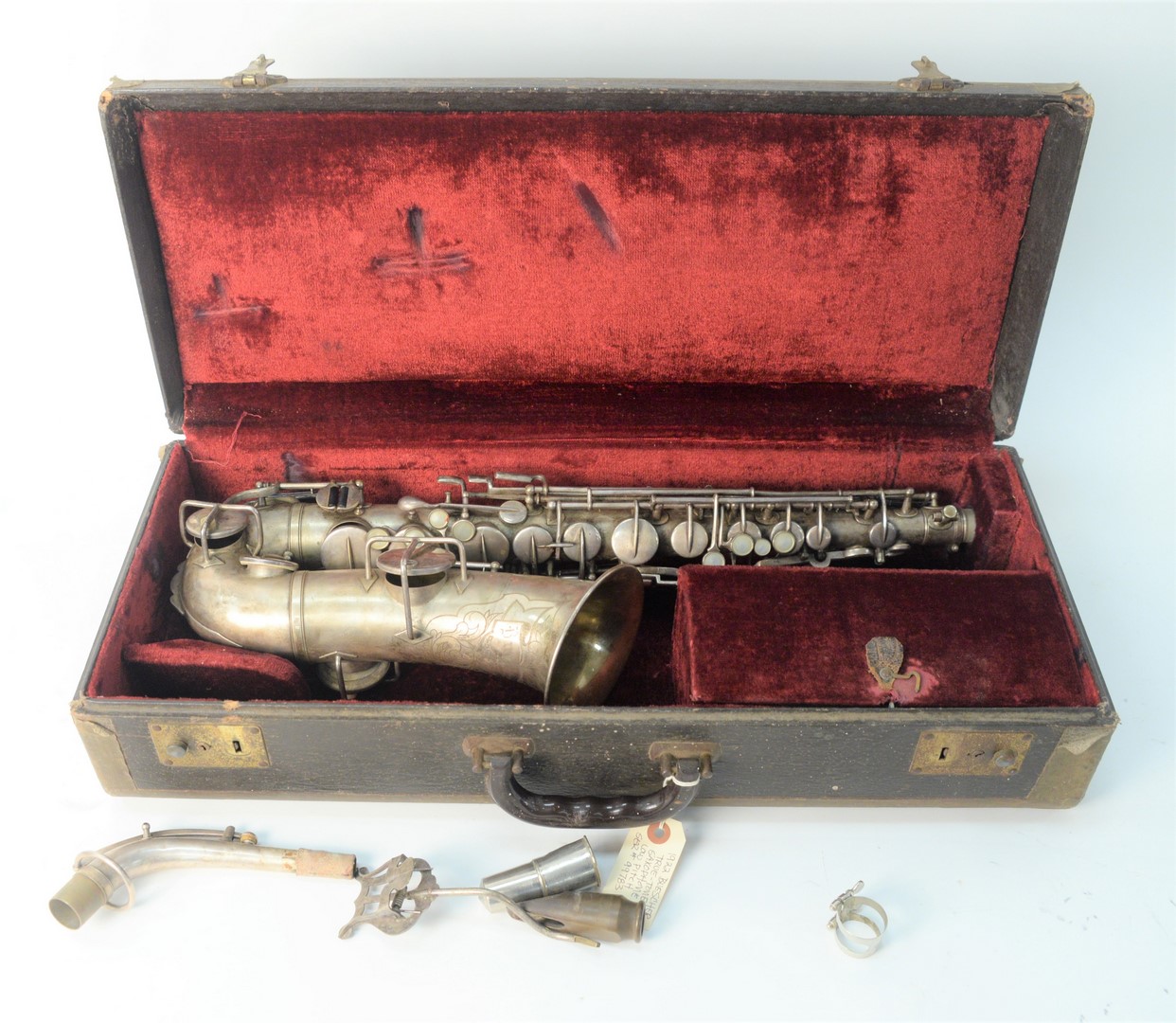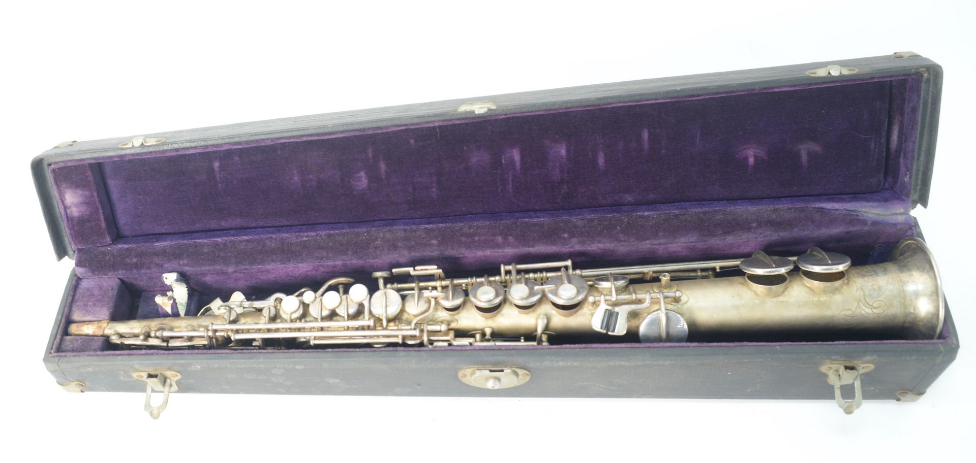 1926 Buescher True Tone Soprano Saxophone, serial #205429, pads and springs in good shape no mouthpiece, needs new corking, original hard-shell case, case length 26 1/2 inches.