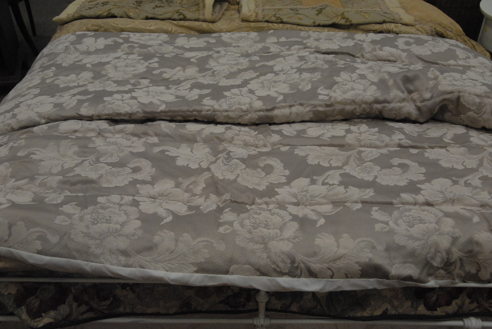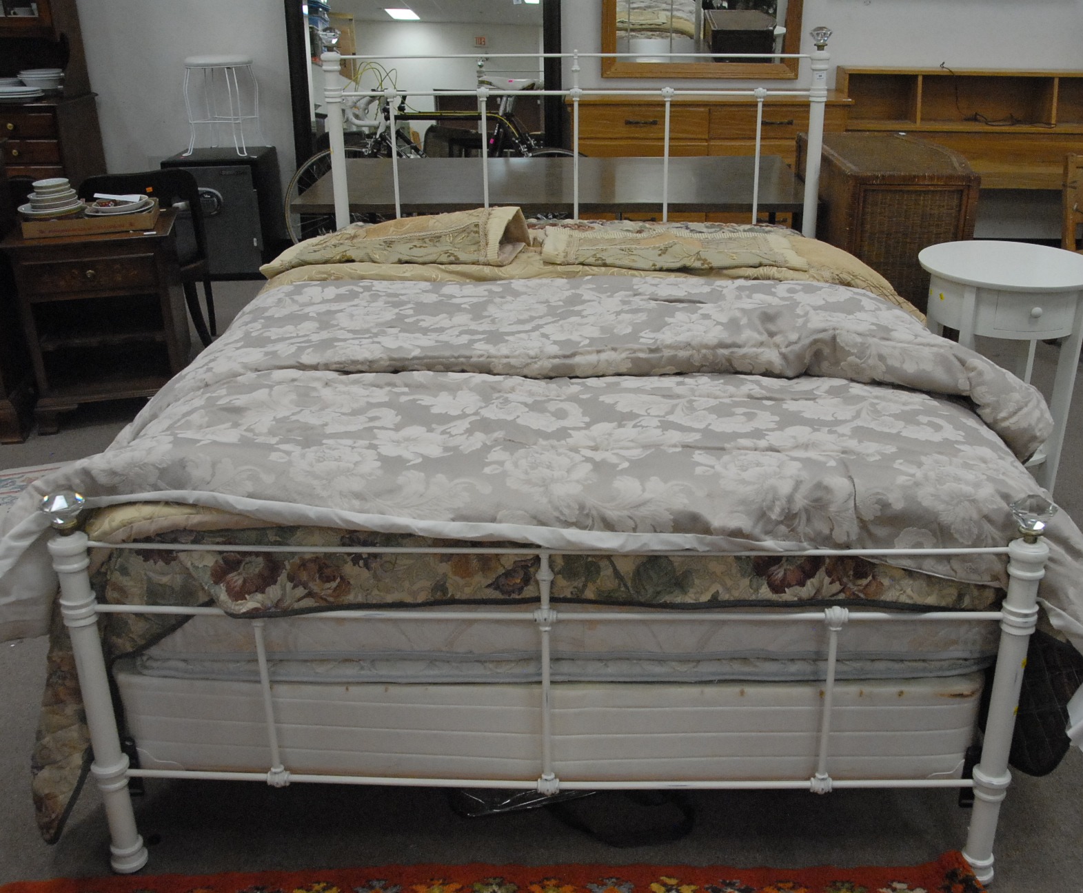 Iron queen size bed complete, wicker chest, and round white night stand.