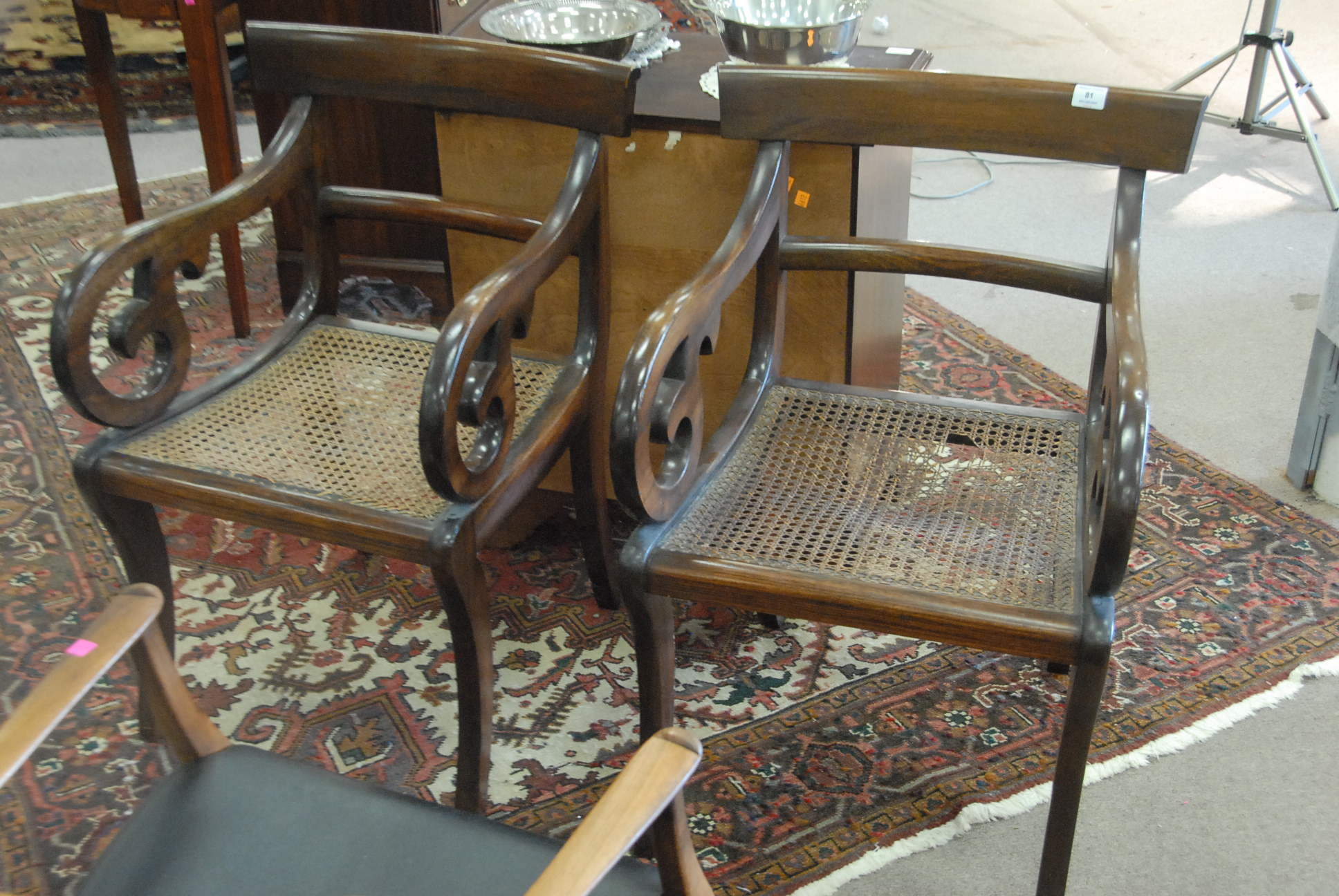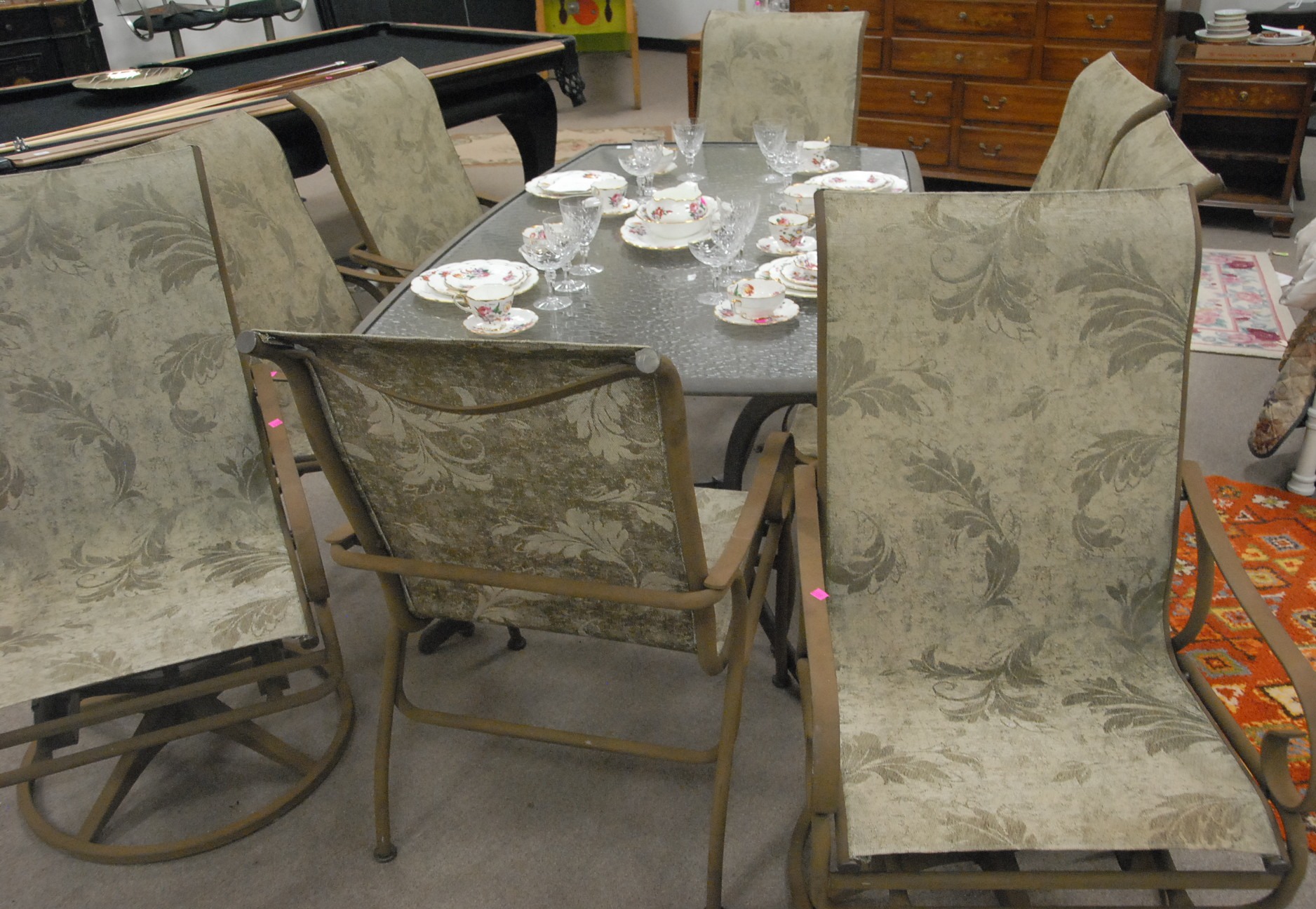 Nine piece outdoor set table, six chairs, and two matching swivel armchairs, table: lg. 68, wd. 42.