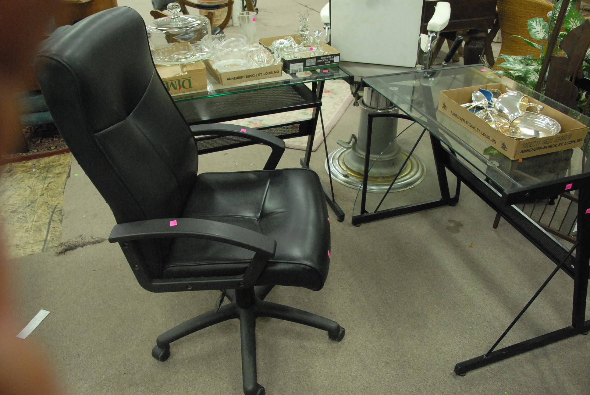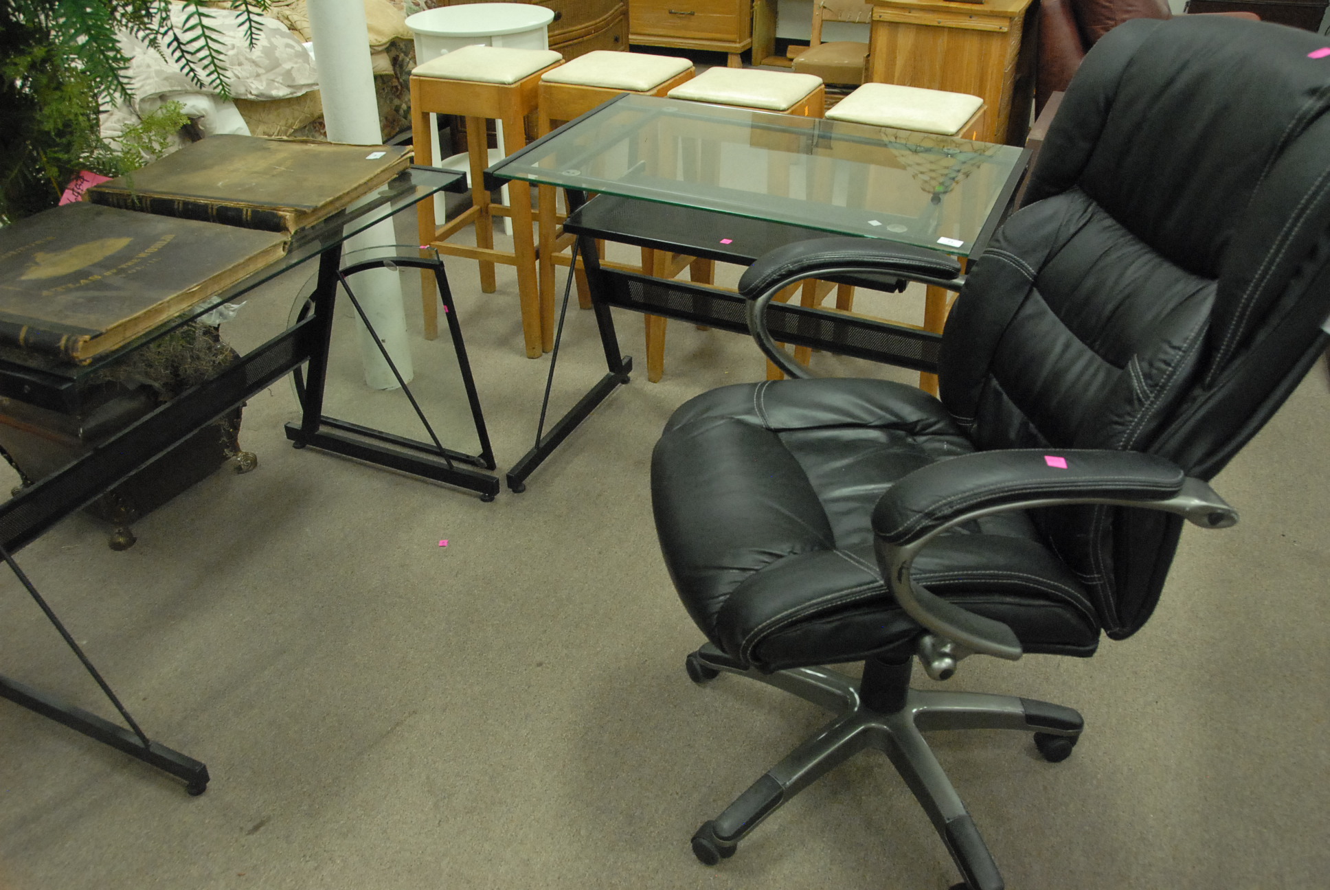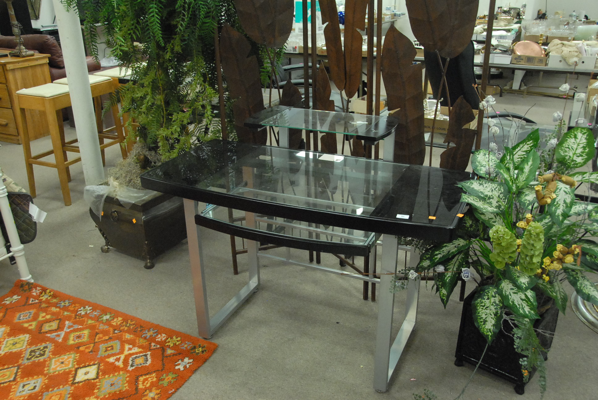 Group lot glass computer desk, metal three fold screen, two planters with artificial plants.