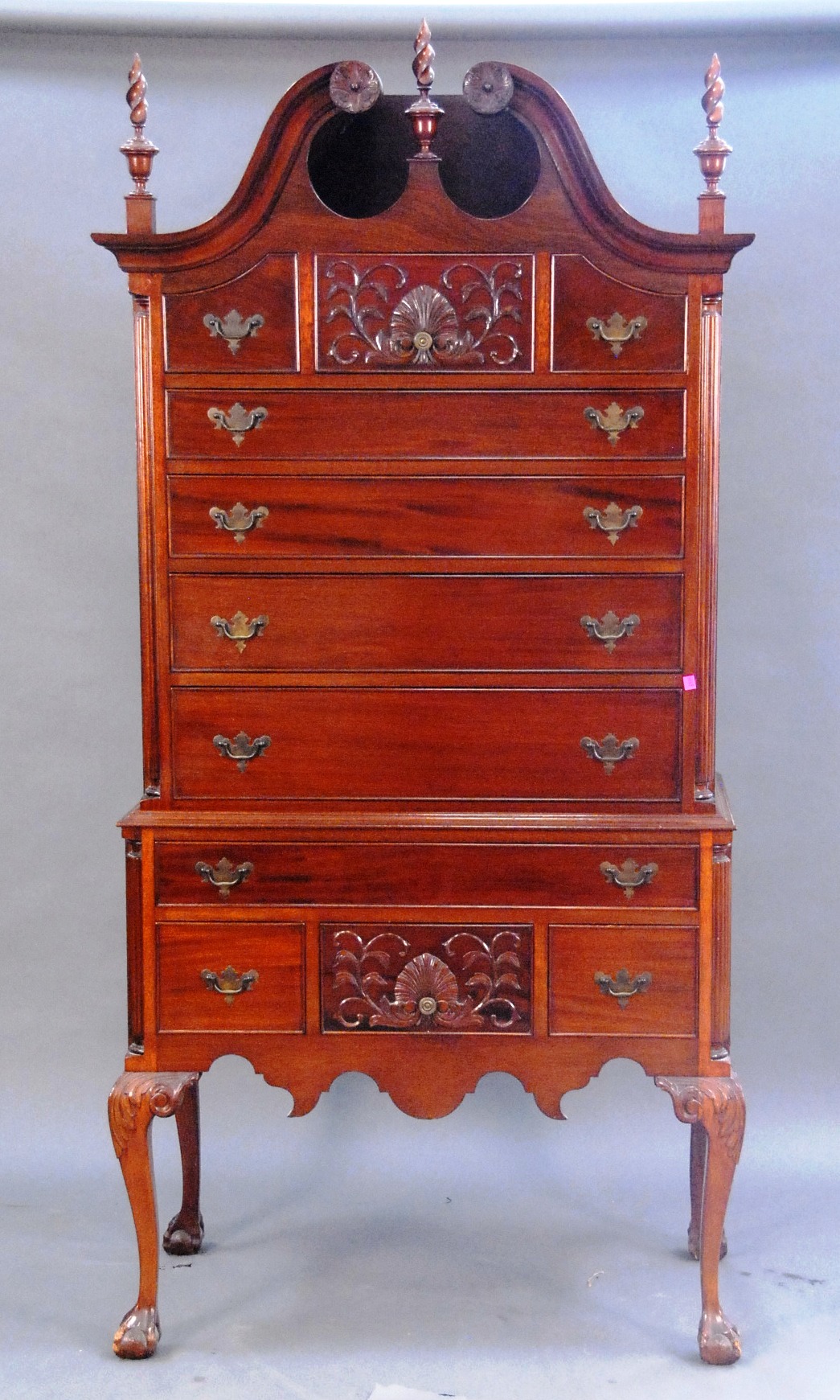 Kaplan Furniture Company custom mahogany Chippendale style highboy with shell carved center drawers, ht. 81, wd. 38 1/2, dp. 20.