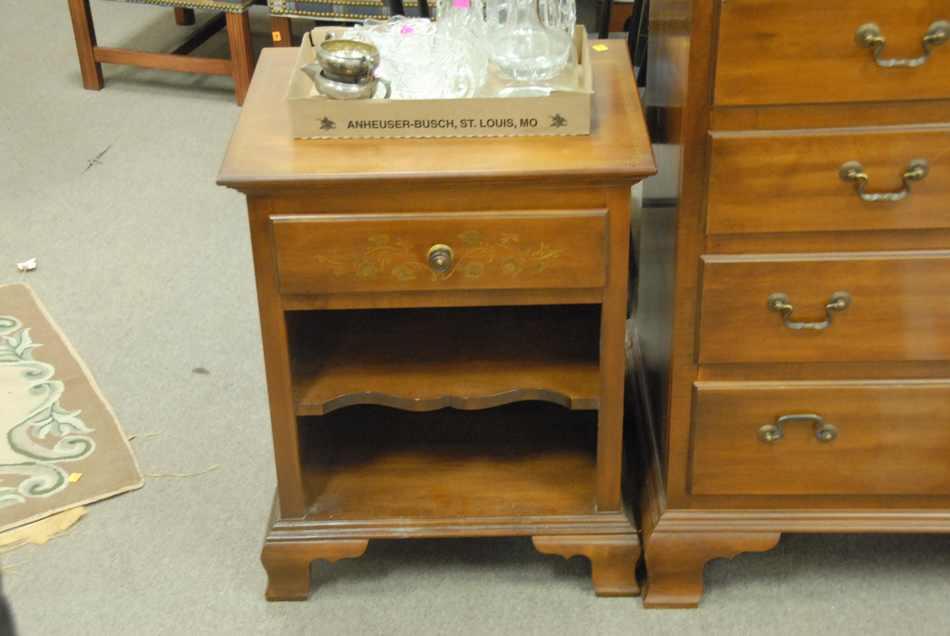 Pair of Hitchcock maple night tables with one drawer and stenciling.