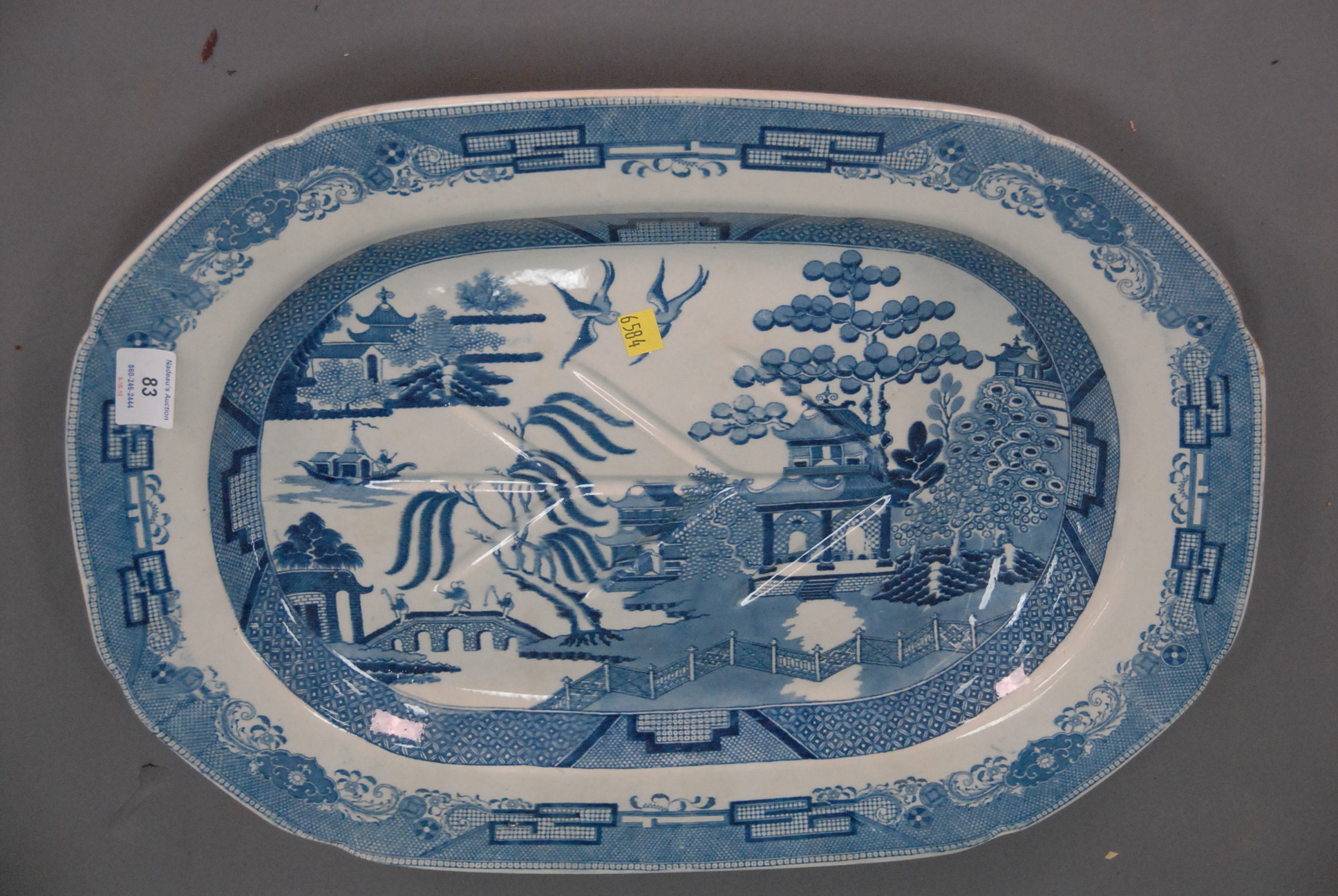 Well and tree pattern blue and white footed platter in excellent condition, 21 x 16.