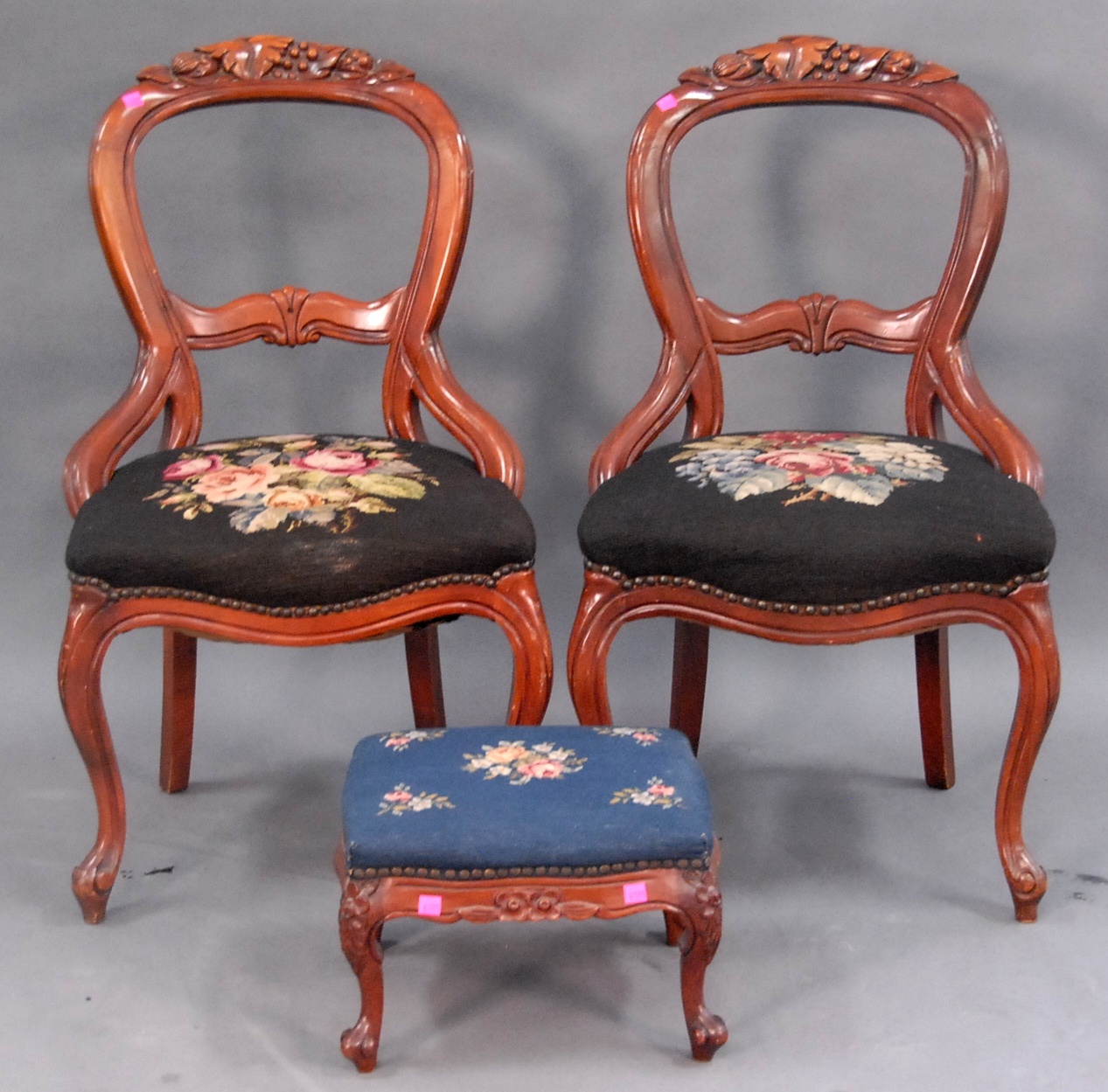 Five piece Victorian lot four Victorian side chairs with needlepoint seats and needlepoint foot stool.