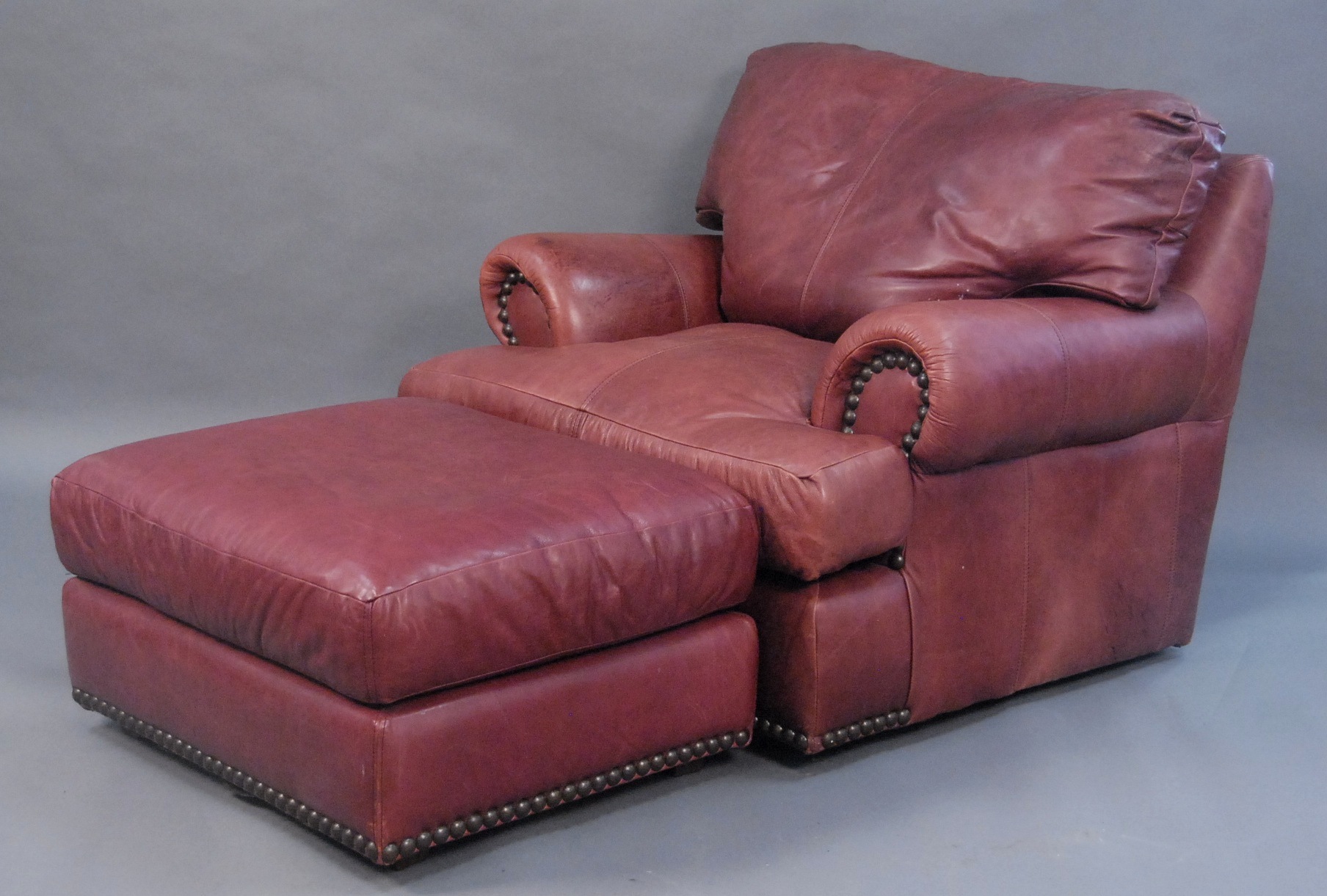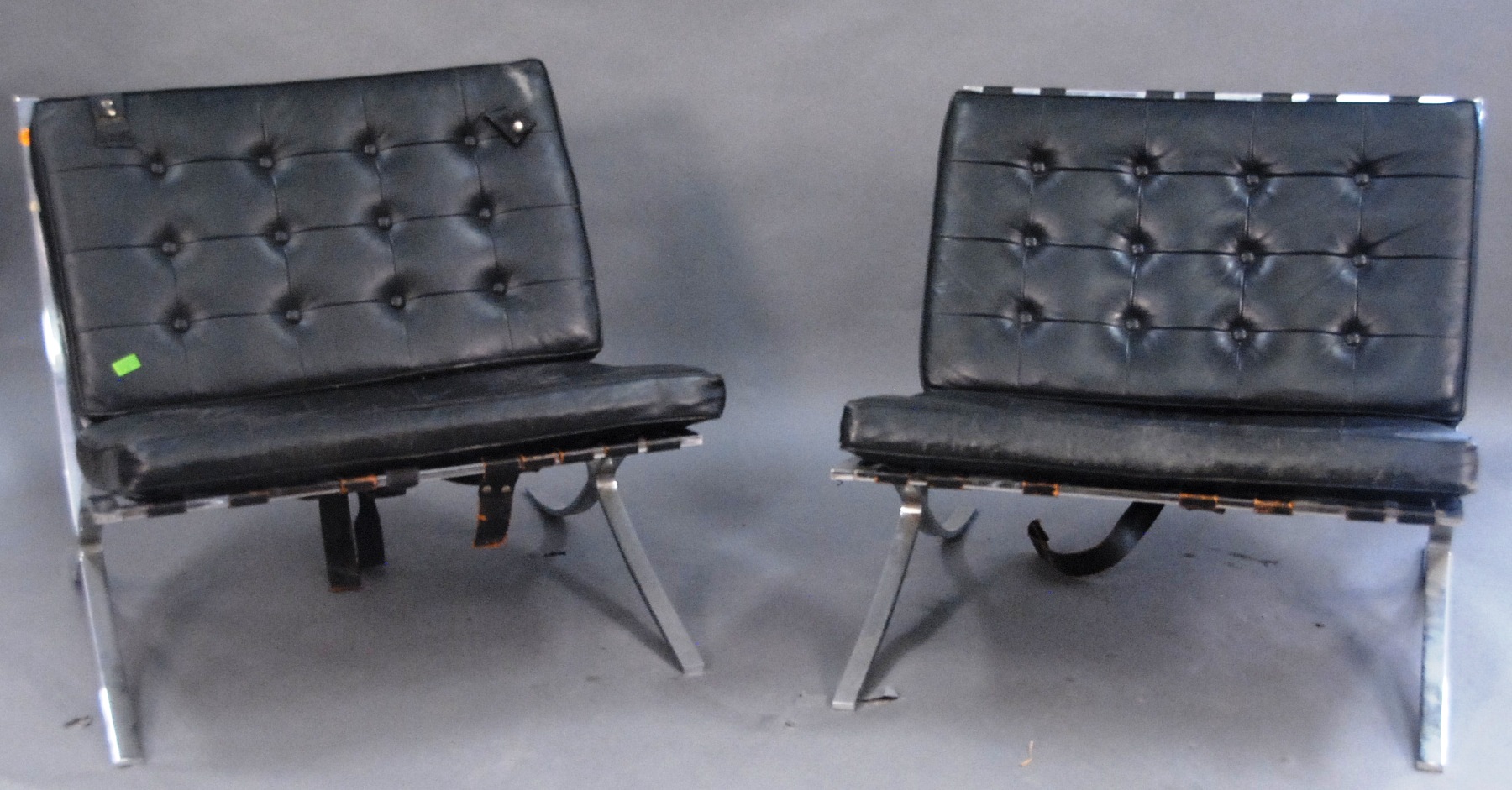 Pair of Mies van der Rohe, Barcelona style, lounge chairs with chromed steel frames and tufted leather loose cushions.