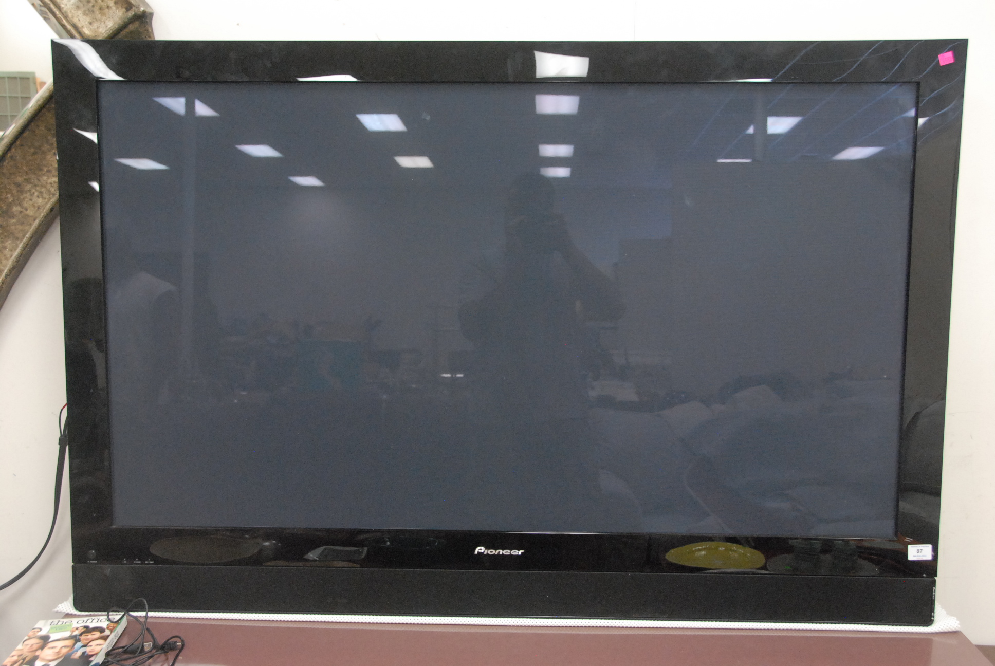 Pioneer flat screen 60 inch plasma television / TV, two Definitive tower speakers, Phillips DVD player, Yamaha receiver, and wall bracket.
