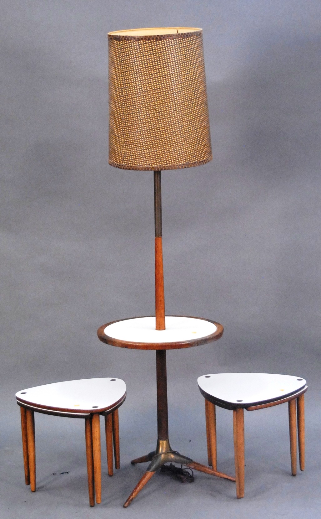 Mid-Century Modern floor lamp with a shelf at mid-column along with a set of four stacking occasional tables each with wooden tapered dowel legs and Formica tops.