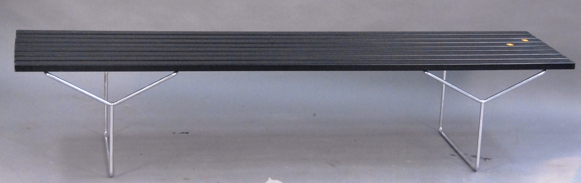 Harry Bertoia for Knoll coffee table/bench with ebonized wood slats on a chrome rod base, ht. 15, lg. 72, wd. 18 1/2.