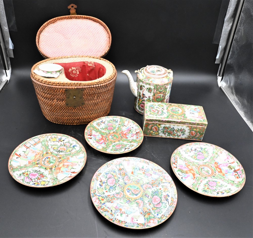 Rose Medallion Porcelain Group, to include a covered box, plates, and a tea basket fitted with teapot and cups; length 7 1/2 inches. Provenance: An estate from Redding, CT.