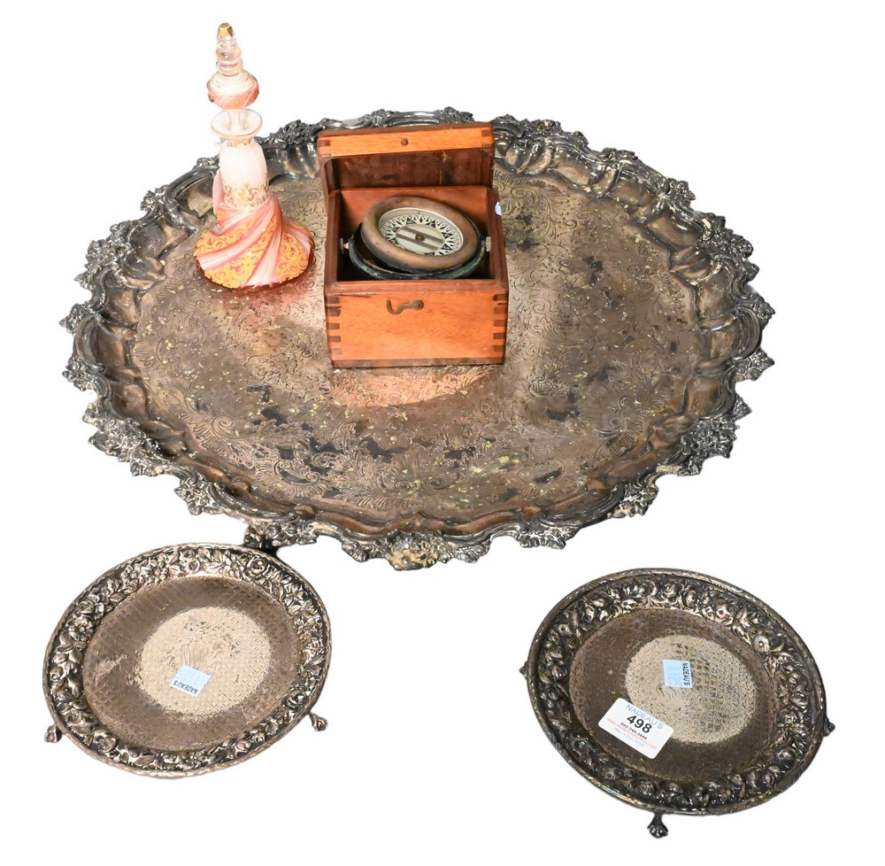 Five Piece Lot, to include ships compass; two sterling silver footed small trays; cut overlay bottle, height 9 inches; along with a large round silver tray, diameter 22 inches. Provenance: Estate of Florence Yannios, Cheshire, CT.