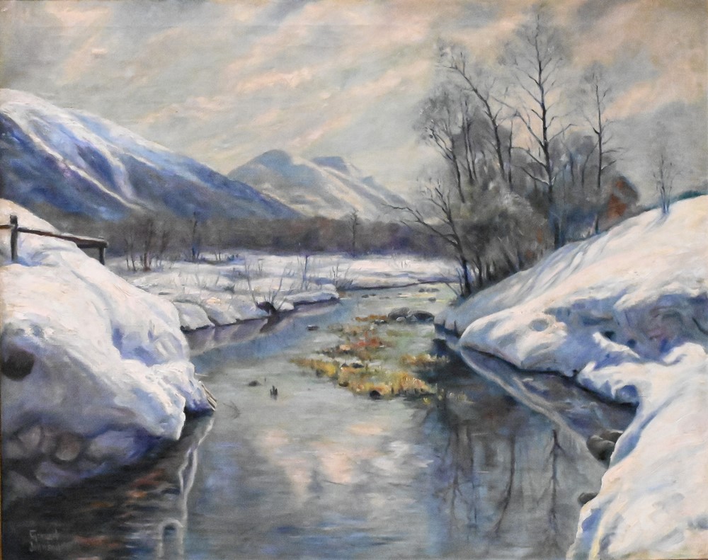 Guy Carleton Wiggins (1883- 1962), snowscape, oil on canvas, signed lower left Guy Wiggins, 25″ x 30″. Provenance: Estate of Florence Yannios, Cheshire, CT.