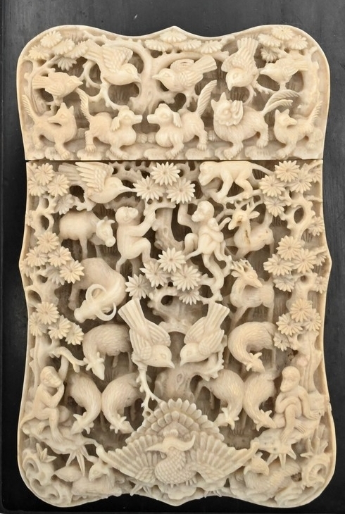 Carved Ivory Card Holder, having carved deer, birds, dogs, and figures, length 4 1/2 inches. Please note: Items containing ivory cannot be purchased or shipped by bidders residing outside of the United States or California, Hawaii, Nevada, New Jersey, New York, Washington, Oregon, or District of Columbia. If an ivory item is purchased by a bidder in one of the above mentioned locations or attempts to ship ivory to one of the above mentioned locations, bidder will forfeit the item and be responsible for any incurred fees such as a restocking fee.