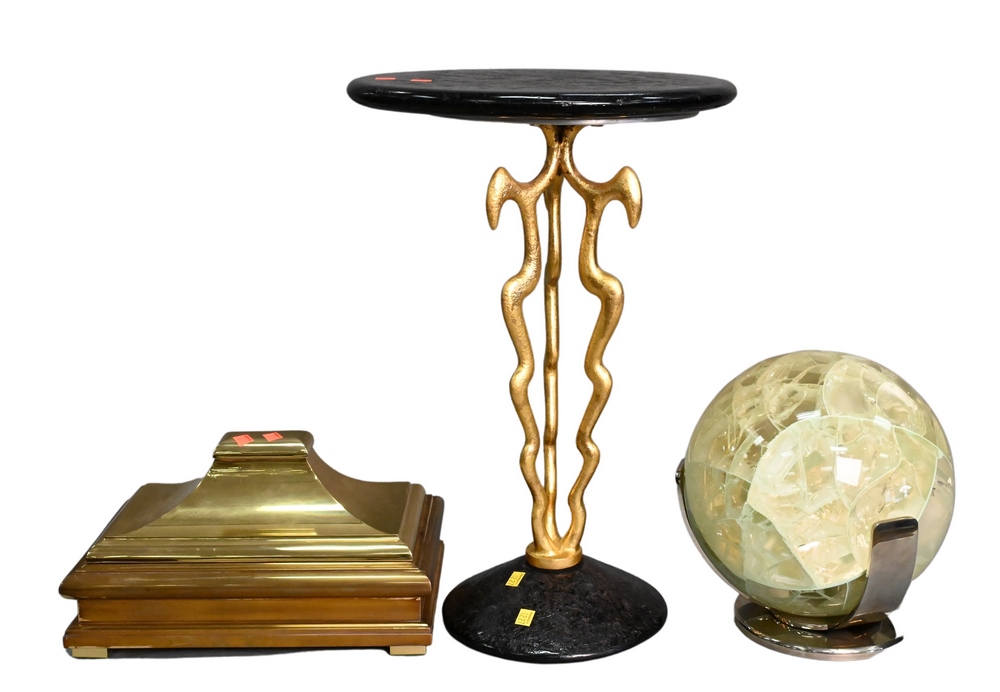 Group of Three Assorted Items, to include a Lucite acrylic crackle ball on chrome stand, height 13 inches; brass box; and a contemporary stand having gold painted base and marble top