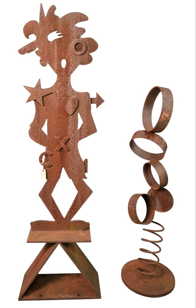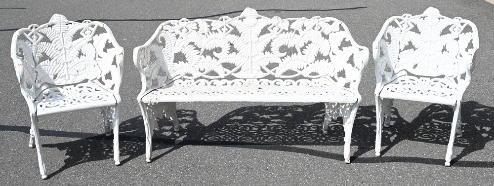 Attributed to JW Fiske New York Iron Three Piece Set, in fern leaf pattern, to include settee #222 1/2, along with a pair of fern chairs #263, height 32 1/2 inches, length 54 inches, width 23 inches.