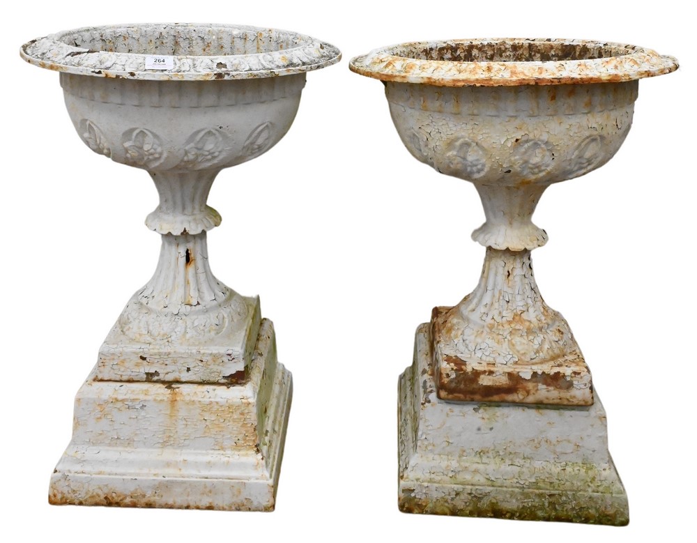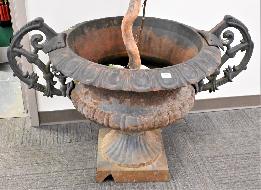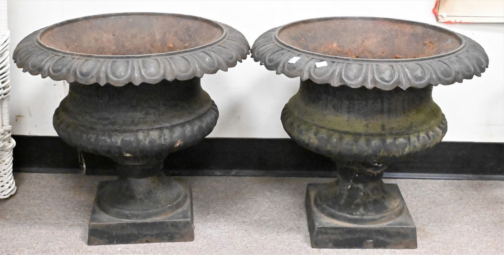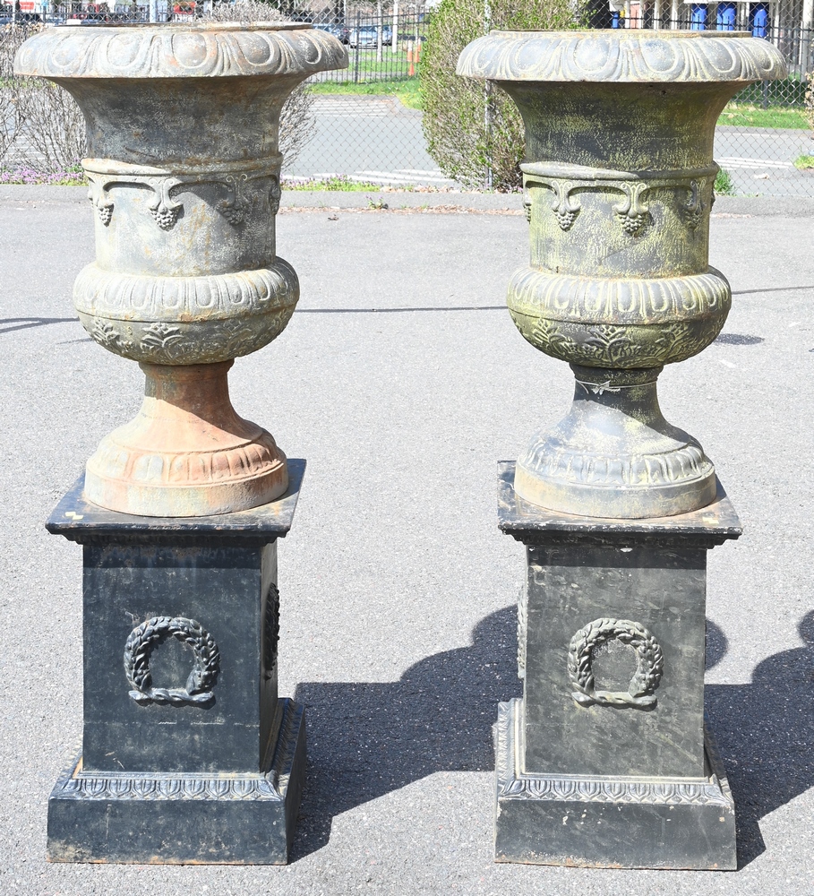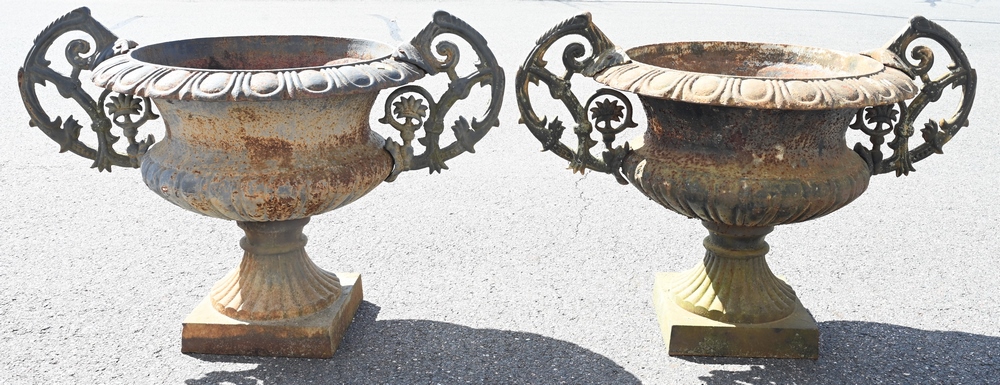 Pair of Large Iron Urns, having openwork handles on square footed bases, (one small chip in base), height 29 inches, width 47 inches, diameter 24 inches.
