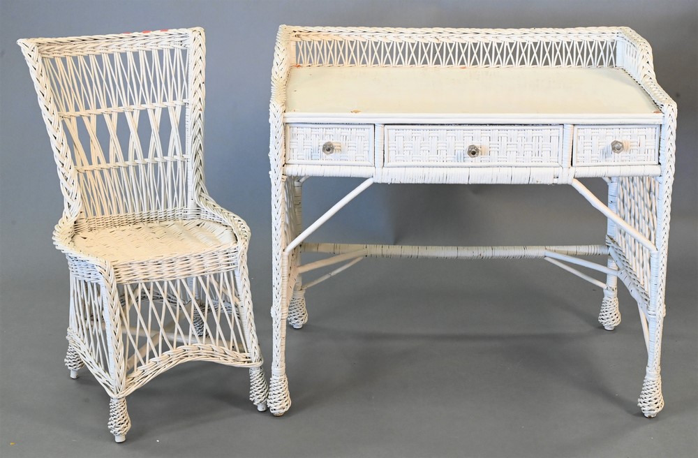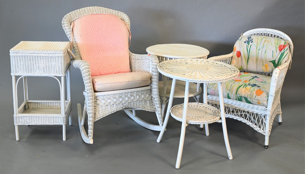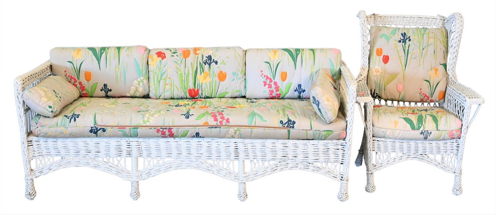 Vintage Two Piece Wicker Lot, to include sofa and winged chair with cushions, (soiled), sofa height 29 inches, sofa length 76 inches. Provenance: An estate from Redding, CT.